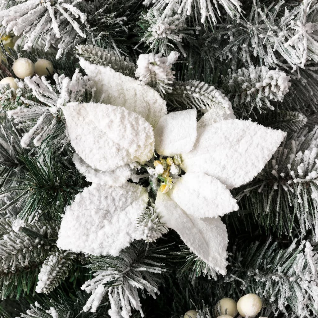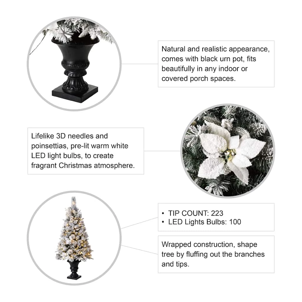 This mixed pine porch tree with decorative urn base is a welcoming addition to doorway, deck, porch or patio. It features snow sprinkled branches and is trimmed with white berries, Poinsettia and holly leaves. This tree is pre-lit with warm white lights that remain lit even if a bulb burns out. Display this attractive greenery in any indoor or covered outdoor location.