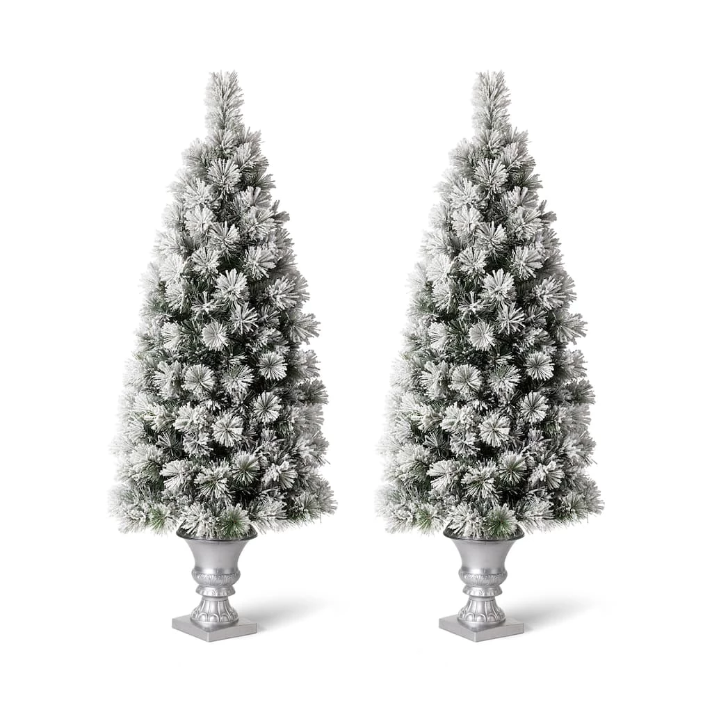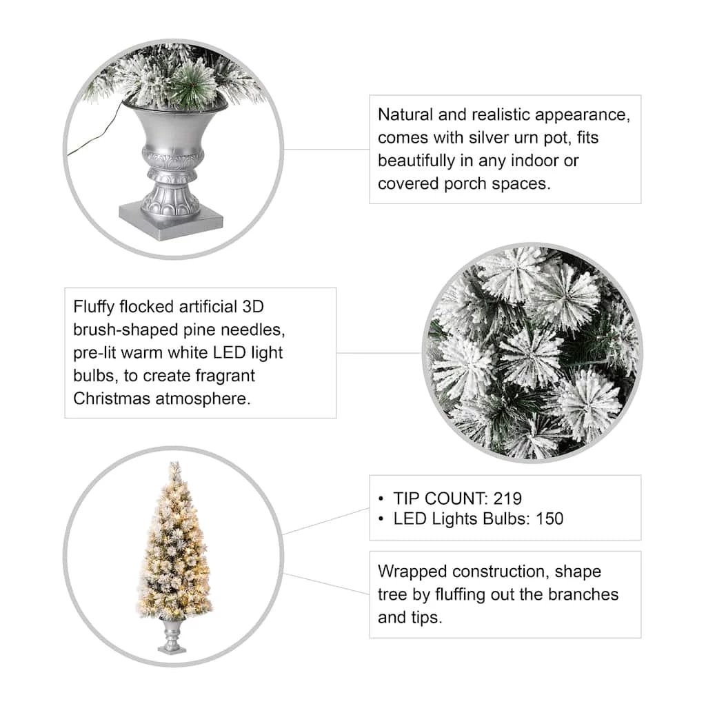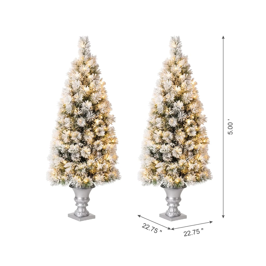 This set of pine porch trees with a decorative silvery base is a welcoming addition to doorway, deck, porch or patio. It features fluffy flocked artificial 3D brush-shaped pine needles, pre-lit warm white LED light bulbs, to create fragrant Christmas atmosphere. Display this attractive greenery in any indoor or covered outdoor location.
