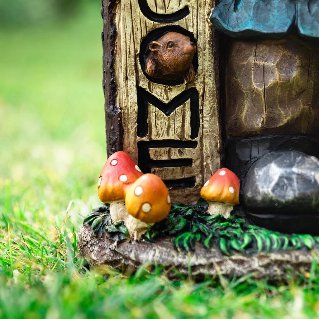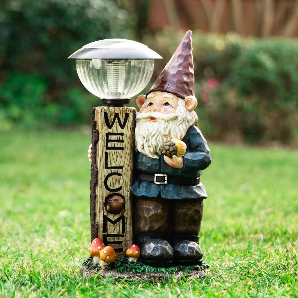 - A cute gnome under lamp post, with imitation wood “WELCOME” sign