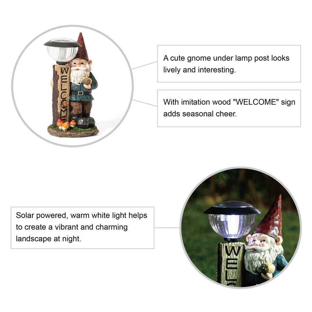 Enhancing your garden with this cute and interesting welcome gnome statue, adds a natural beauty and seasonal cheer to your space. It is constructed of high quality poly-resin that is very durable and light weight. Featured with gnome, faux wood lamp post, mushrooms and squirrel icons, as well as hand-painted retro color palette and antique details, which looks very lively, intriguing, natural and full of vintage charm. Compared to traditional garden statue, it is solar powered, the warm white light helps to create a vibrant and charming landscape at night. This funny and versatile solar gnome sculpture is sure a great decorative figurine to highlight your garden, porch, backyard or home! Also a great gift for your family or friends!