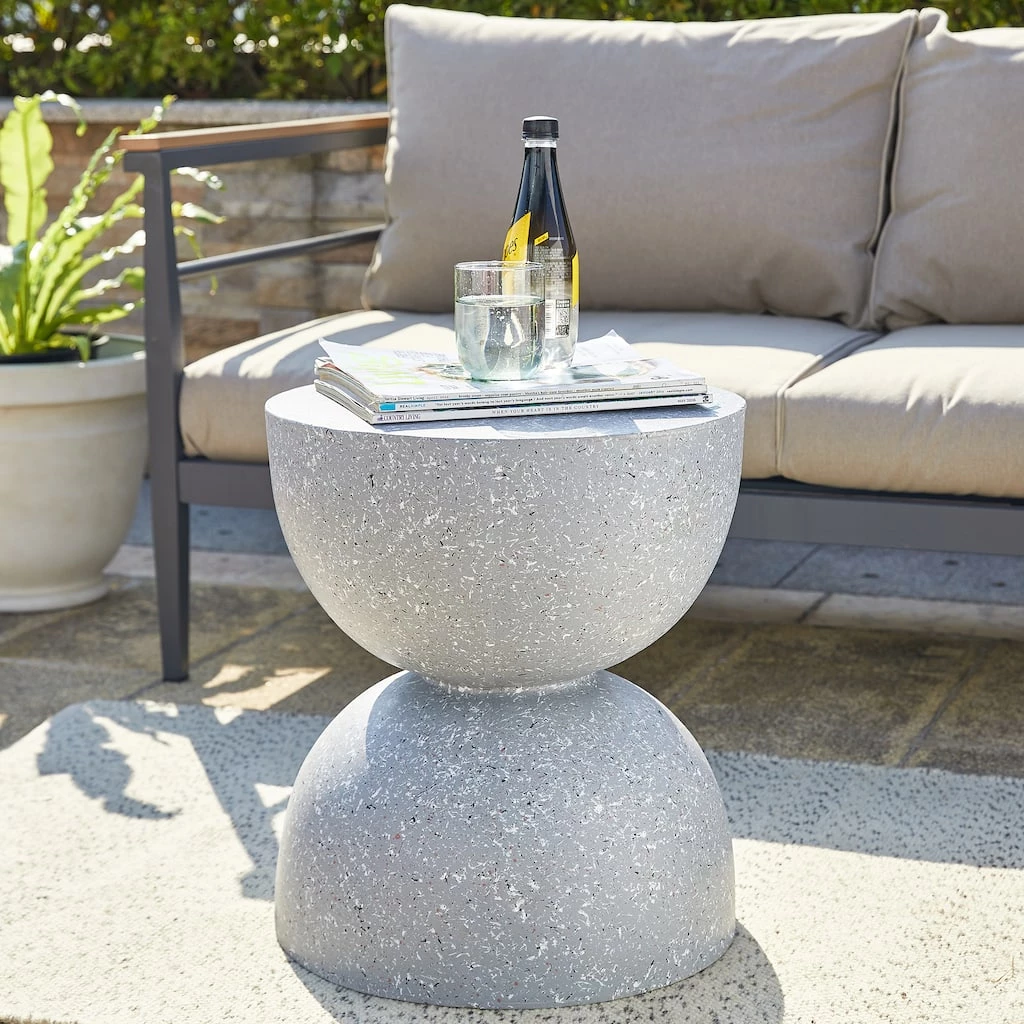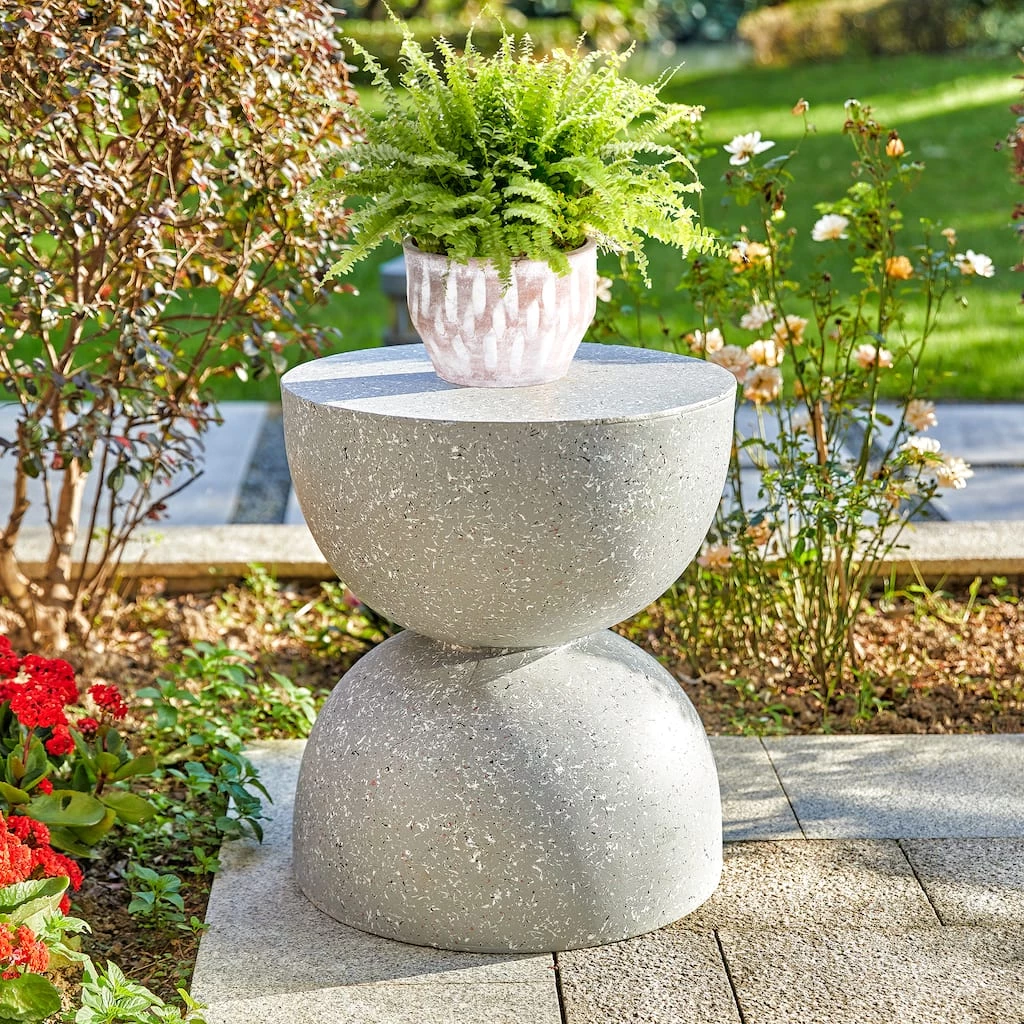 This modern and minimalist hourglass stool with imitation terrazzo is stylish and multi-functional. It is not only suitable for your garden, patio or yard as a stool, planter stand or side table, but also suitable for your living room or bedroom as an accent table. Sit on it to have a rest, or place your planters, flowers, foods, cocktails or anything you want on it, and then just enjoy a good time!