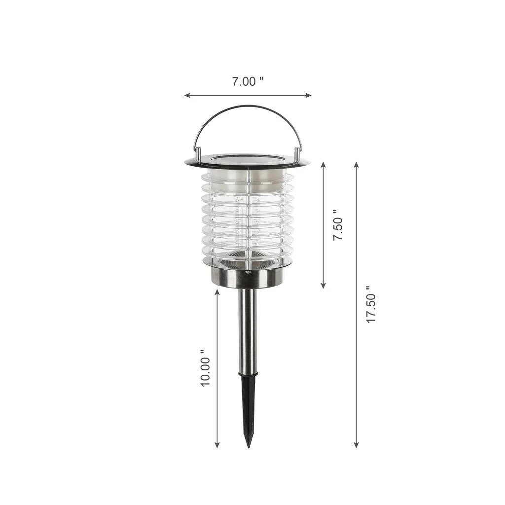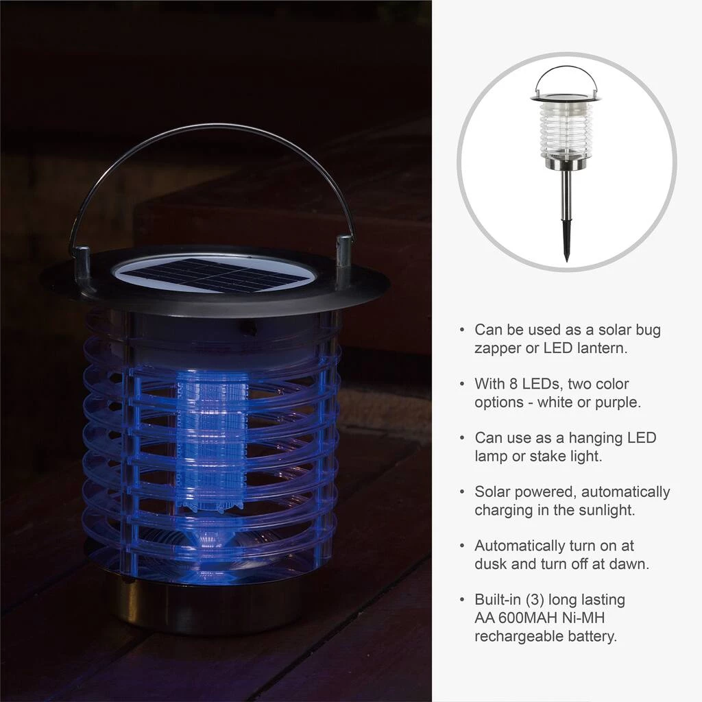 This dual mode solar lantern and bug zapper lamp is made of high quality stainless steel and plastic. It has both a hanger and ground stake, which is very durable and versatile. You can not only choose white to use it as a nice LED light, but also choose purple to use it as a UV insect catcher lamp to protect yourself from mosquito, moths, flies or any other dangerous insects. The solar panel keeps the rechargeable battery charged in the sunlight and is ready to use at night with no wires needed. This stylish and portable solar light will be a perfect addition for you to enjoy cocktail hours, yard games, camping times in the garden, patio, yard or any outdoor space!