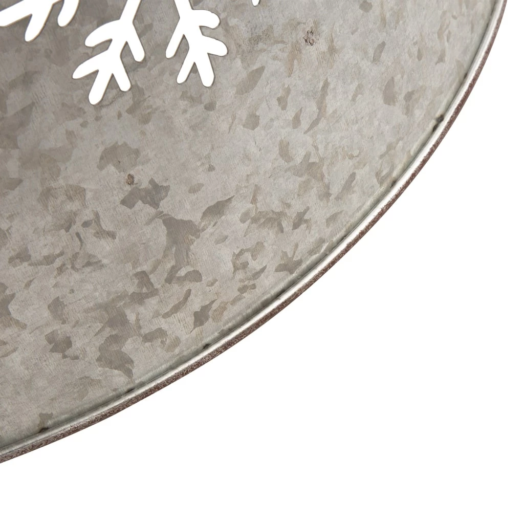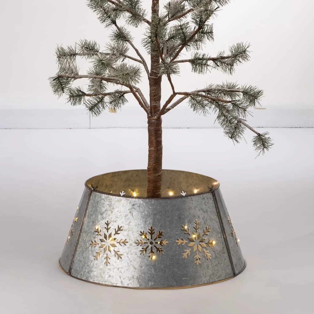Add the final touch to your country Christmas with galvanized snowflake tree collar with lights string. It slightly flares out toward the base, which creates simple framing and covers the tree’s stand. Rustic replacement for the traditional tree skirt .Create a unique look for your Christmas tree this year with this Rustic Tree Collar. This unique collar gives the tree a rustic look while maintaining the holiday spirit.Β