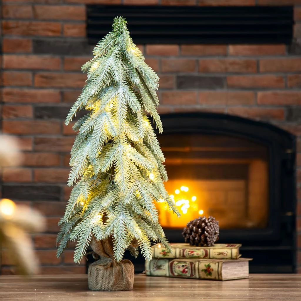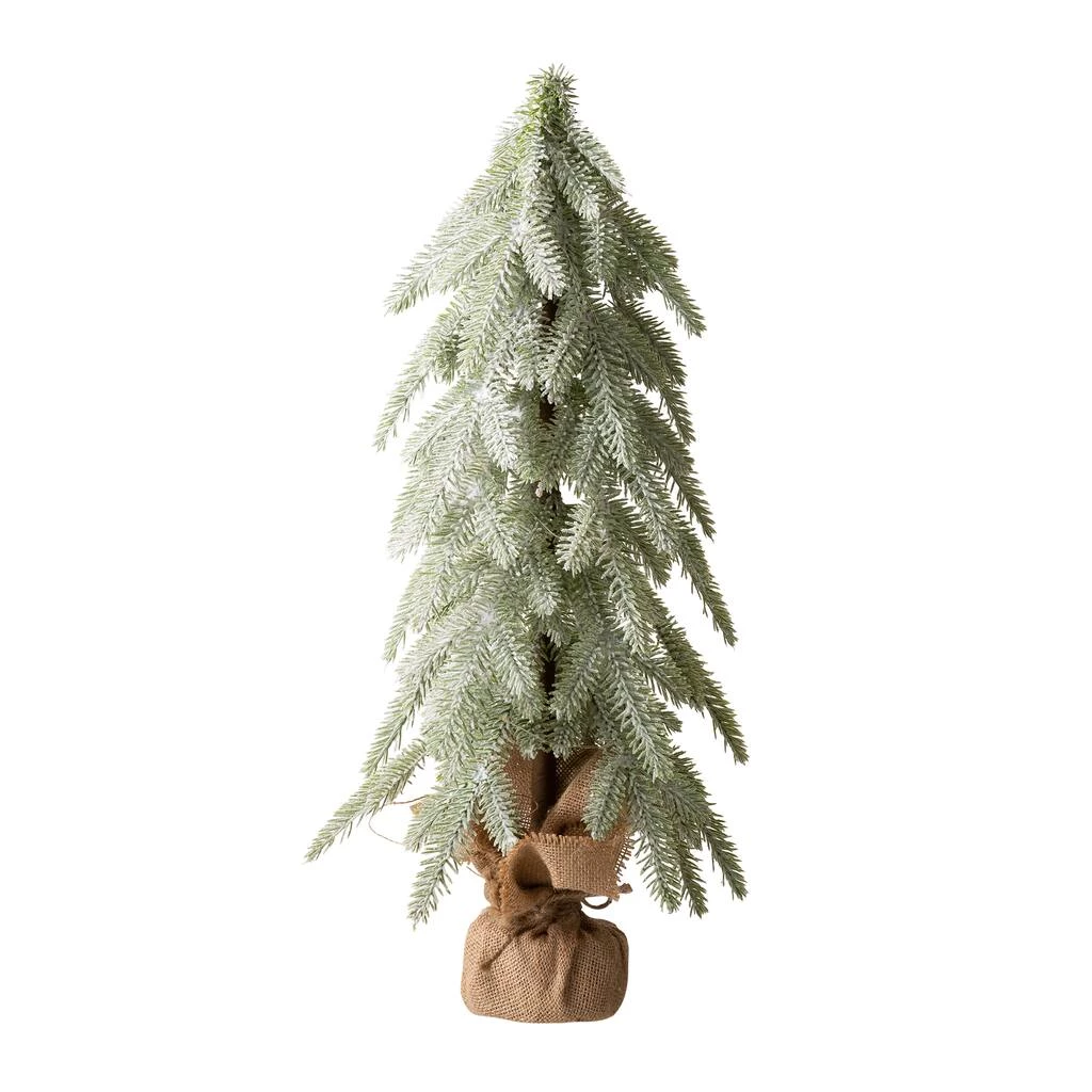This Christmas tree is crafted with artificial heavy snow and the whole tree is twined by warm light string. The bottom is wrapped by sackcloth which creates a unique wintery feel. It will be an eye-catching addition to any room during the Christmas holidays.