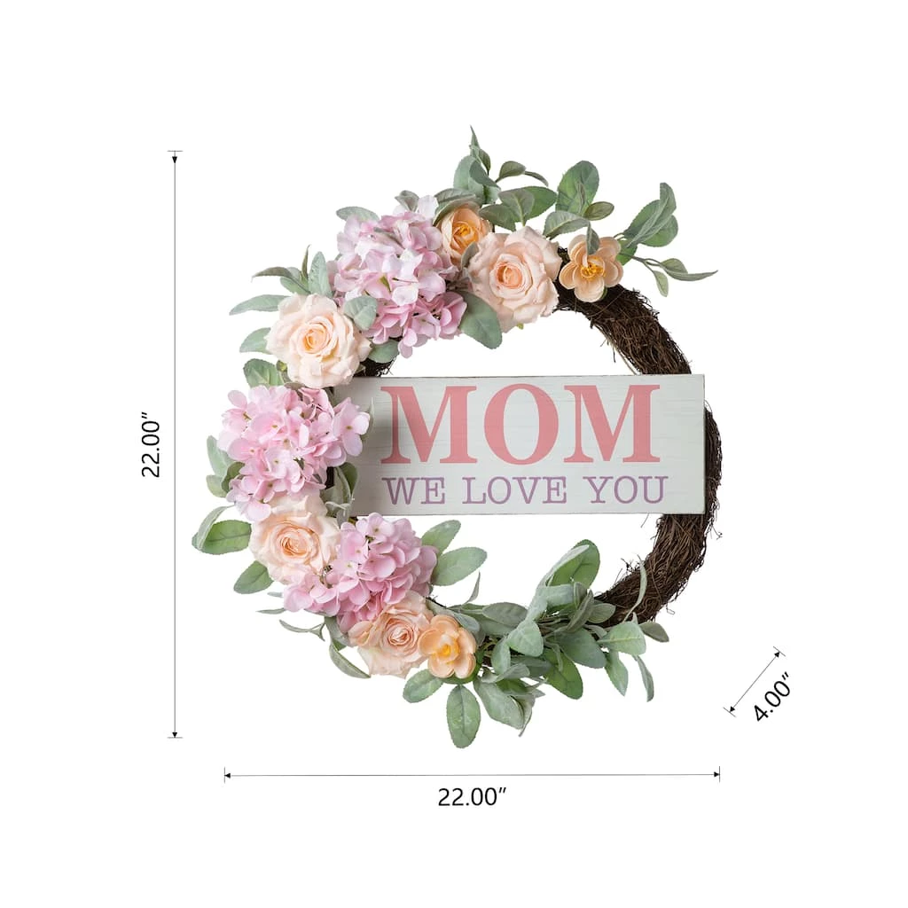 Decorate your home this Mother’s Day with this beautiful floral wreath. Made of vivid roses and hydrangeas and a wood sign that says ‘MOM, we love you’. Perfect for display in your living room, windows, door or back of chair.