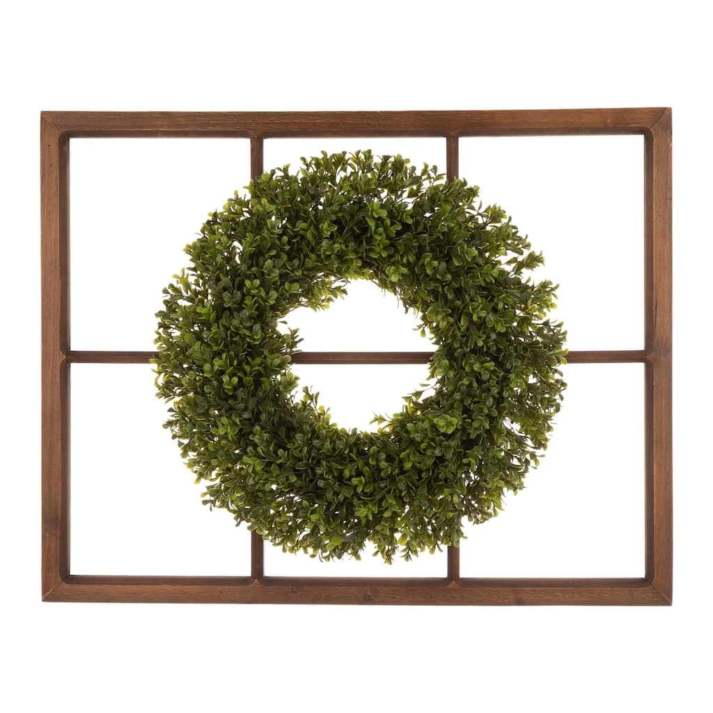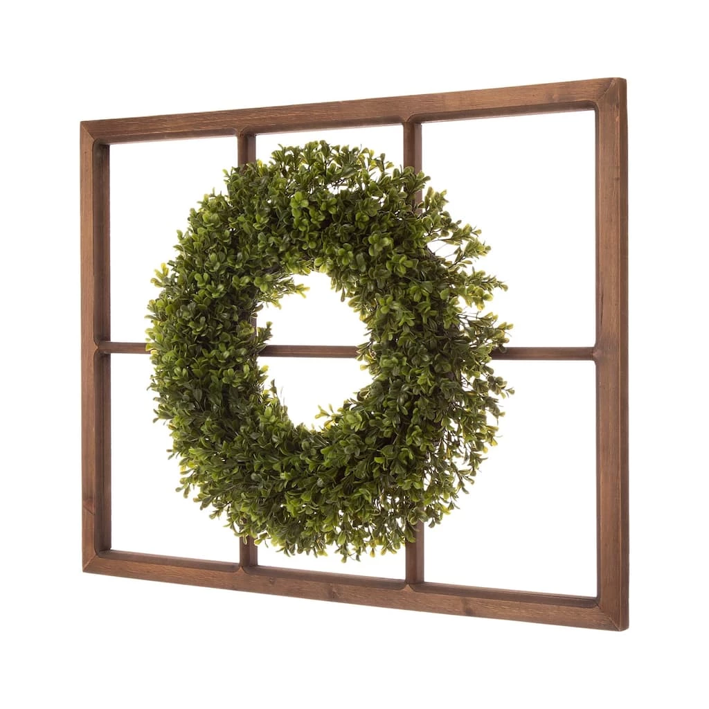 This 18” round artificial boxwood wreath by Glitzhome features life like boxwood leaves around the perimeter sitting on a 22” wooden window frame. The greenery is treated to withstand UV exposure and resist fading for years of beauty.Β