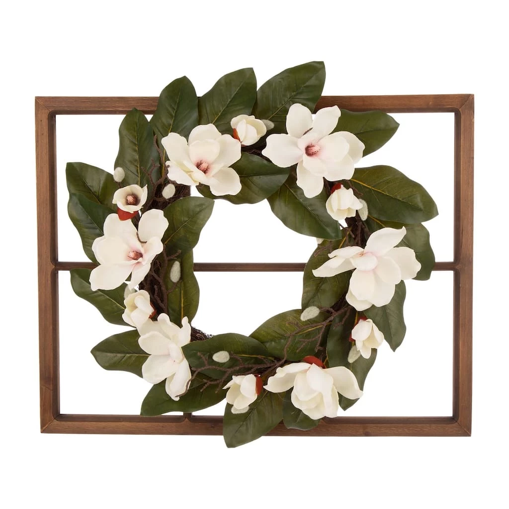 This artificial magnolia wreath maintains its vibrant beauty all year long. It also can be matched with our high quality tobacco basket or window frame to offer an attractive entryway that welcomes your closest family and friends into your home.Β