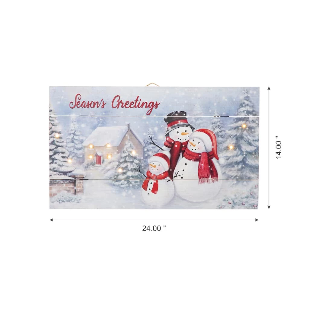 A delightful and festive addition to your holiday decorating, this wooden dΓ©cor features a snowman surrounded by snow covered evergreens and a house. It reads “Season’s Greetings”, while 10 snowflakes sparkle and shine warm white LED lights.
