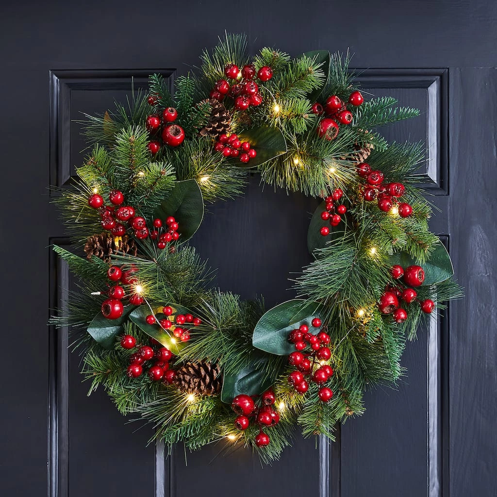 Welcome Christmas with this wonderful wreath. It features pine needles, large pinecones and leaves, as well as red berries. Place it on the door, entryway, windows and more for more traditional and classic touch.