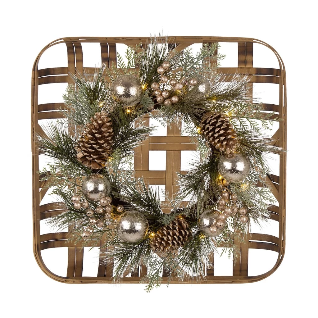 Adorn your home with lots of holiday style! This Christmas mix basket wreath features a grapevine base adorned with glittered greenery including a mix of silver ornaments and pinecones, giving your holiday a festive feel. Affixed to the back is a square, shallow woven basket that gives this piece a holiday-inspired feel. It’s perfect for decorating your front door or for use as an entryway feature to greet you guests this holiday!