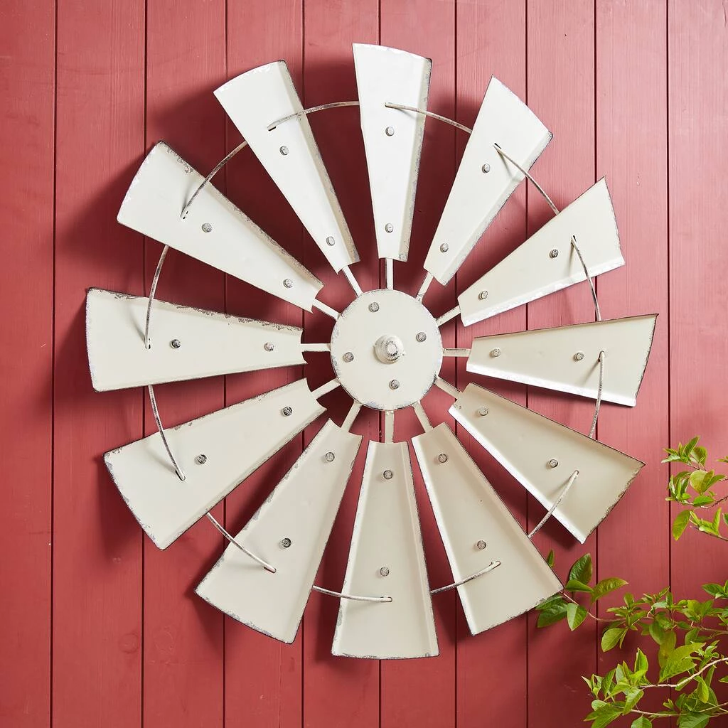 Bring the feel of a rustic farmhouse to your home with this galvanized fan-shaped wall dΓ©cor. This beige wind spinner is made of premium, 5 mm metal, so it’s sturdy and rustproof. The surface of the spinner has been processed with environment-friendly materials, and is coated with SGS-certified paint. Flanging on both sides give the fan depth. The gourd hole in the back allows for easy hanging.