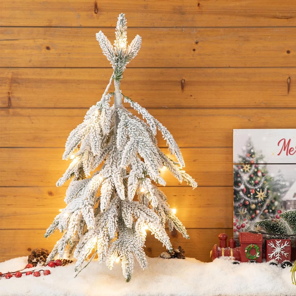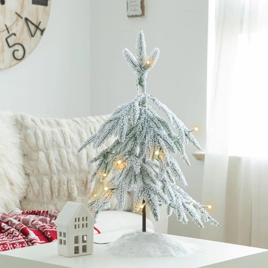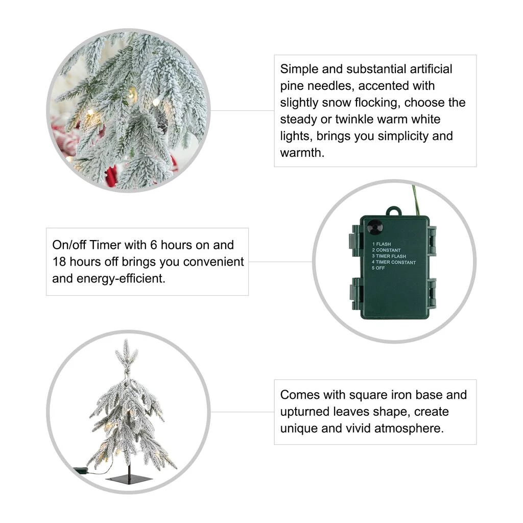 The 2 ft. pre-lit flocked pine artificial Christmas greenery table tree features crafted branch tips to create a warm festival ambiance to any space and daily dΓ©cor for your house and work space.
