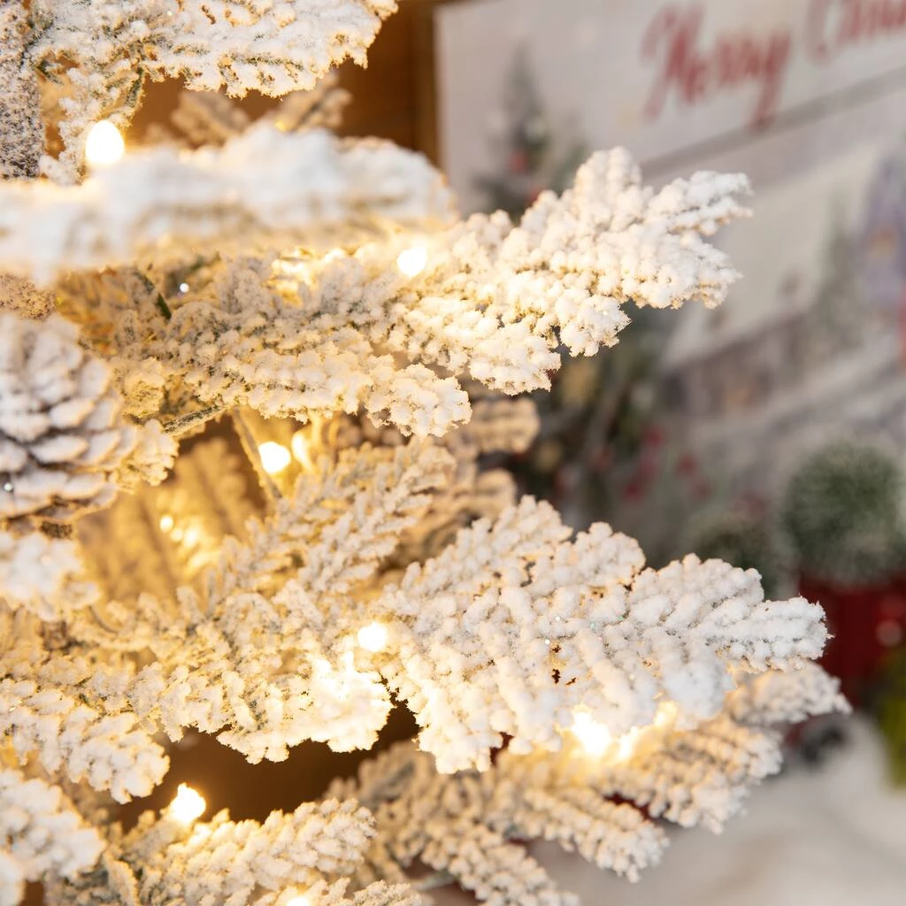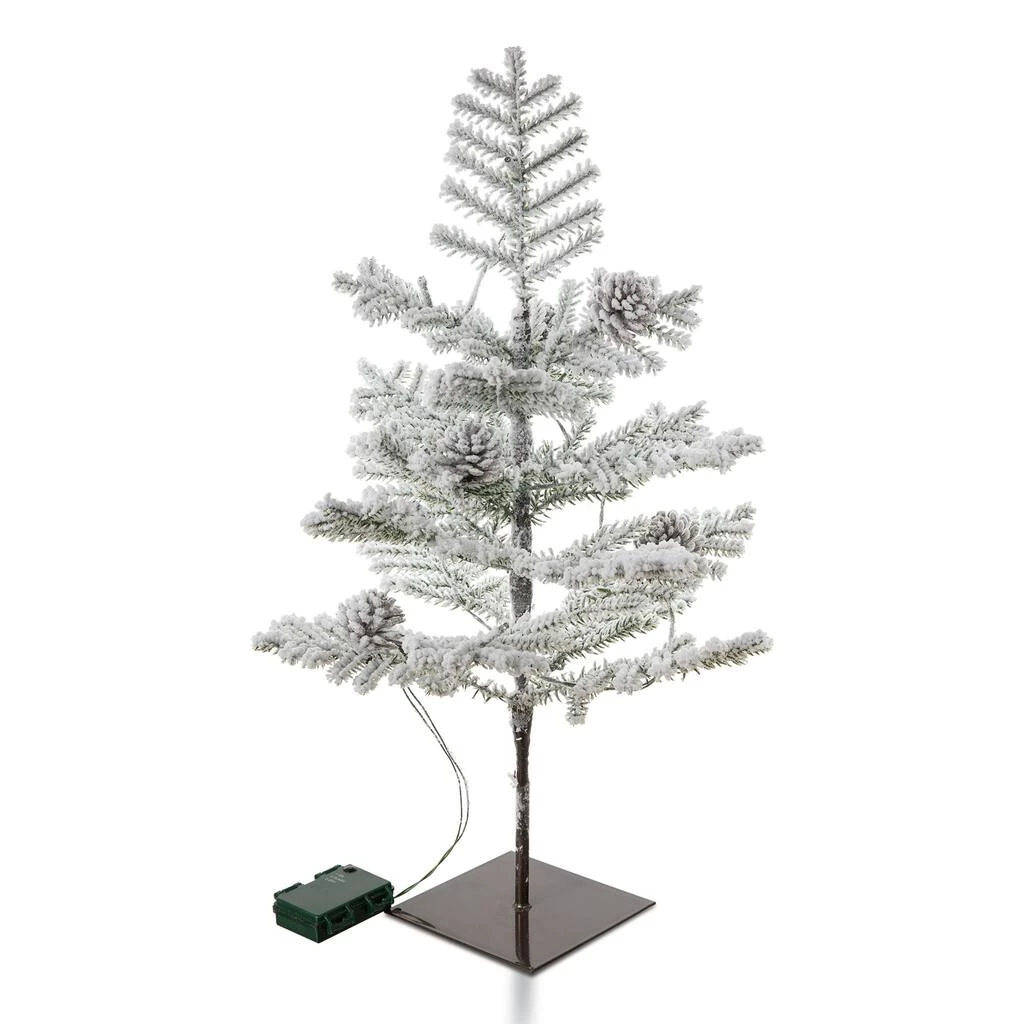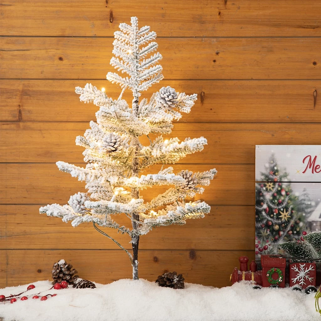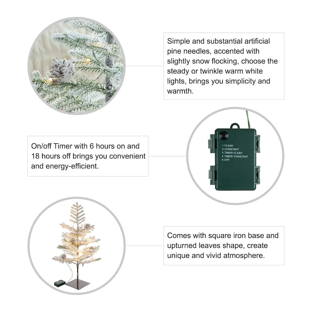 The 2 ft. pre-lit flocked pine artificial Christmas greenery table tree features crafted branch tips to create a warm festival ambiance with pinecone accent to any space and daily dΓ©cor for your house and work space.