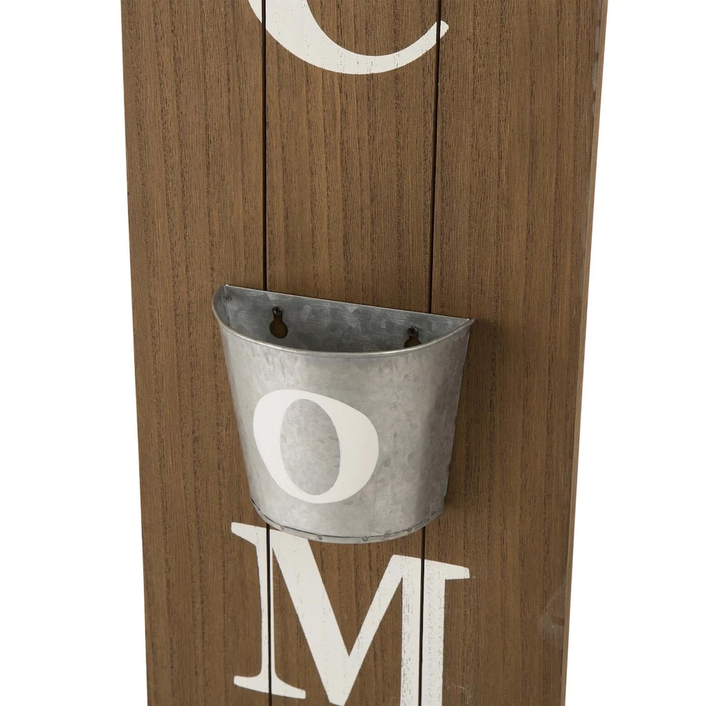 This stylish and inspirational porch sign features a small galvanized planter where you can insert different flowers to add seasonal cheer. It’s perfect for welcoming visitors.Β