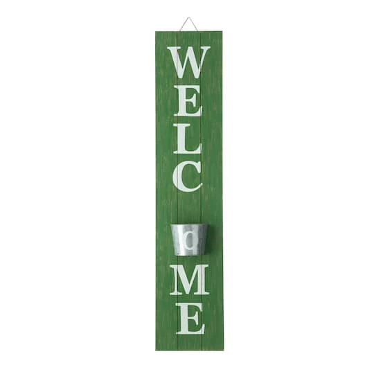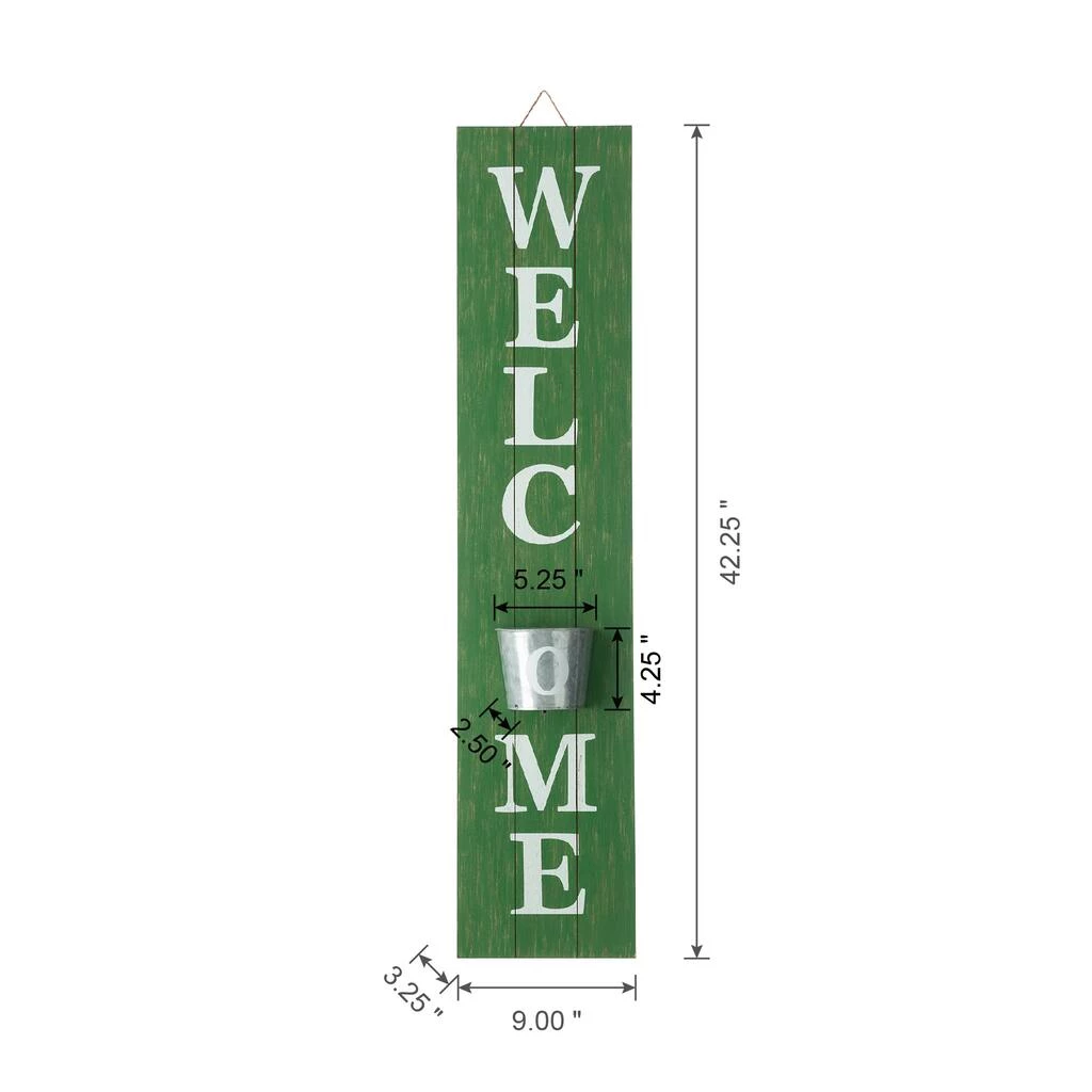 This stylish and inspirational porch sign features a small galvanized planter where you can insert different flowers to add seasonal cheer. It’s perfect for welcoming visitors.Β