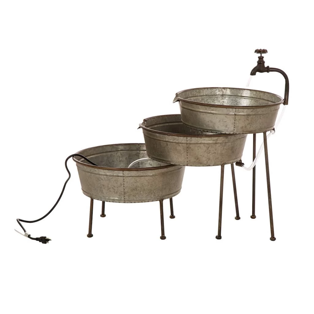 This three-tiered stacking tub fountain would be a great addition to any outdoor or garden area. It is metal material with an electric pump included. Water flows from the vintage looking faucet into the galvanized old washstands resembled tubs. This fountain is intended for outdoor use and is sure to make a statement in your yard. Made of high-quality iron, the surface galvanized design allows water to recirculate through the fountain. The soothing water flow sounds to help you relax. A wonderful dΓ©cor accent for patios and gardens, suitable for use in spring.