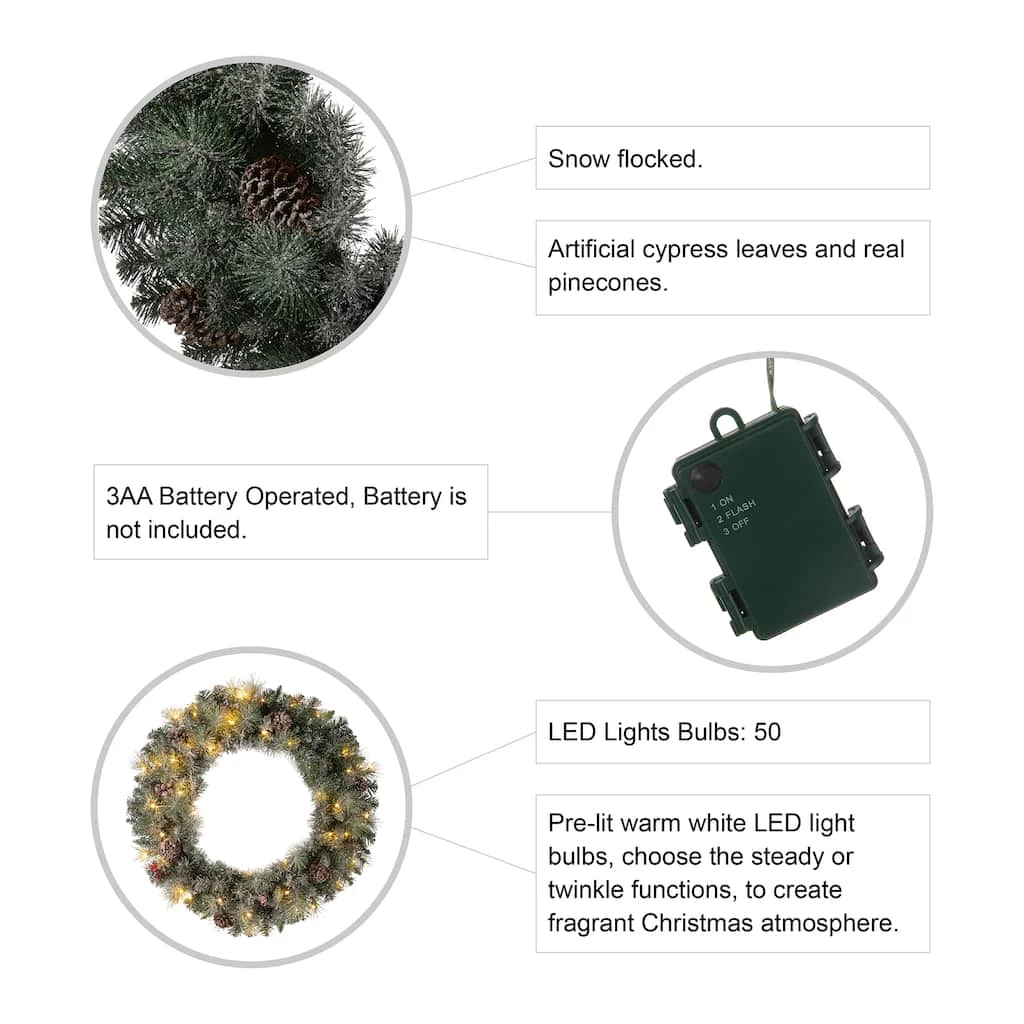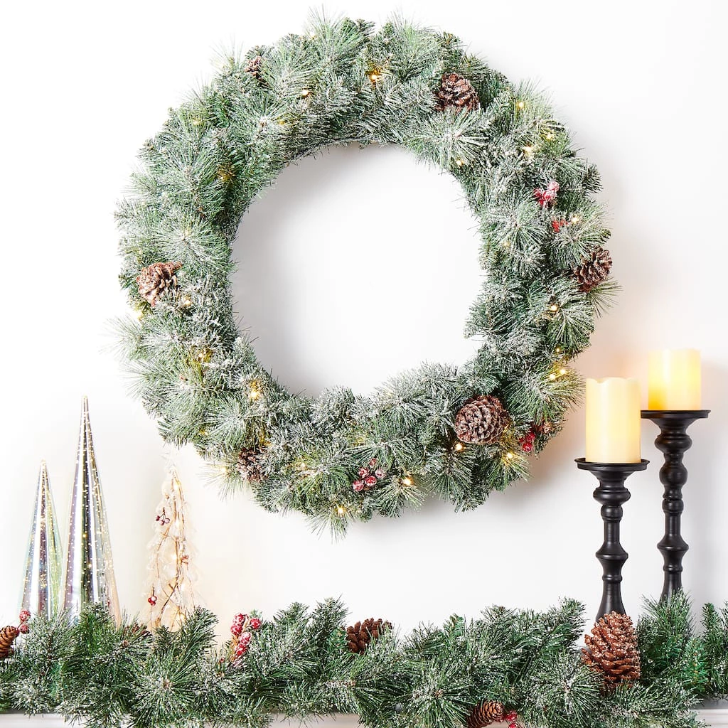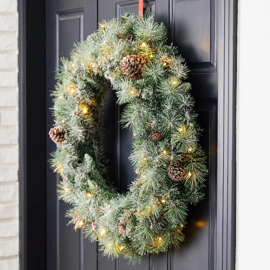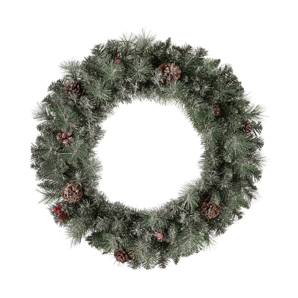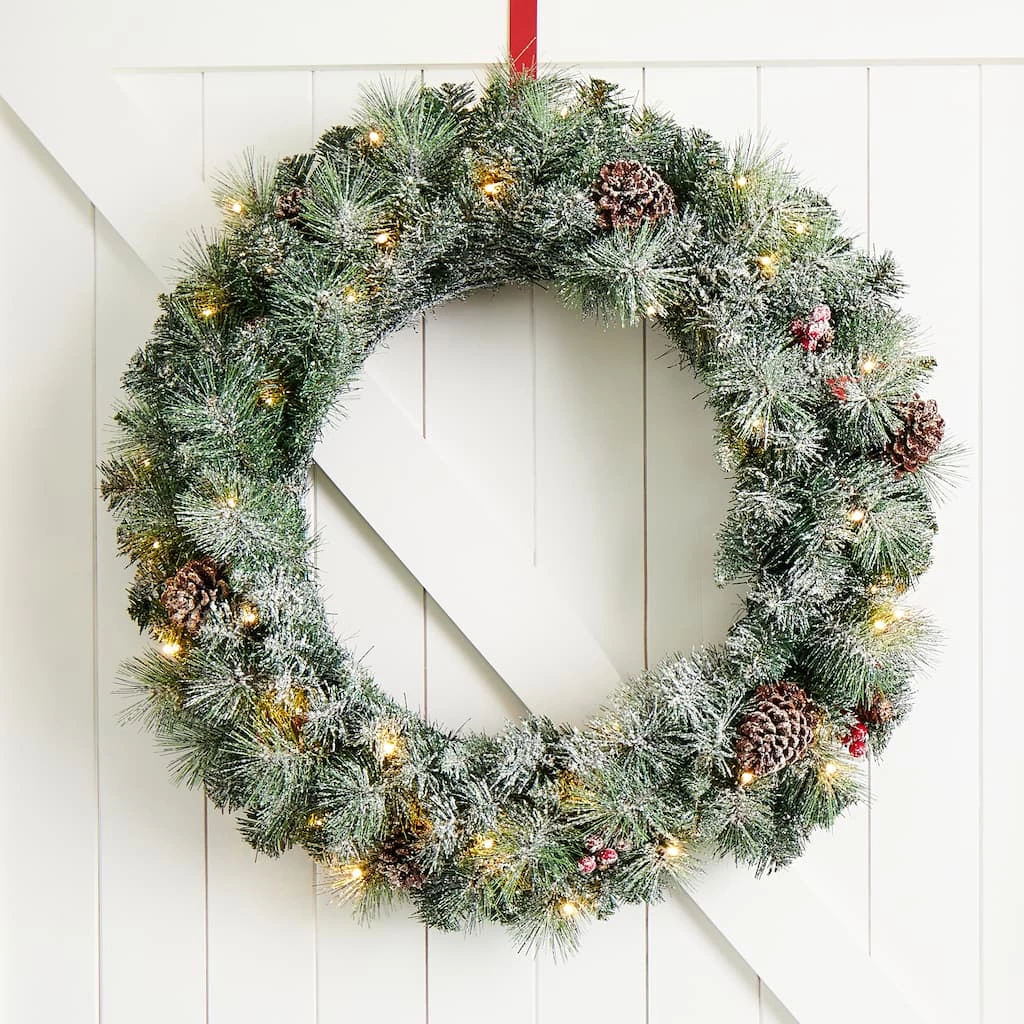 The 30″ Christmas wreath crafted with frosted pine needle tips, pinecones and berries will add a touch of charming light and cheer to your front door or window during your holiday season.