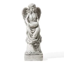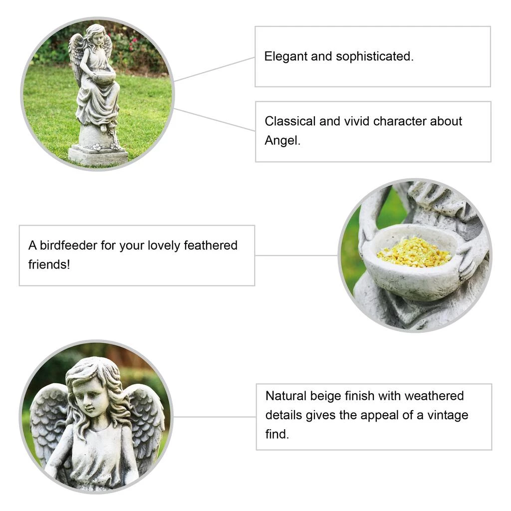 Enhancing your home or garden with this elegant and sophisticated angel statue, brings a touch of spiritual charm to your space. It features a beautiful artistic angel sculpture with wings and holding a bird feeder. Made of high quality MGO and fiberglass that is durable, UV and weather resistant. The handmade sand beige finish with distressed details gives a sense of vintage and advanced texture, easy to blend in with variety dΓ©cor styles. This beautiful and versatile angel statue a perfect addition to your garden, porch, patio, deck, backyard or any outdoor space or even home space! Also a great gift for your family or friends!
