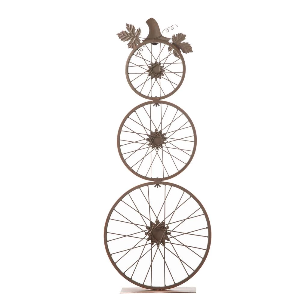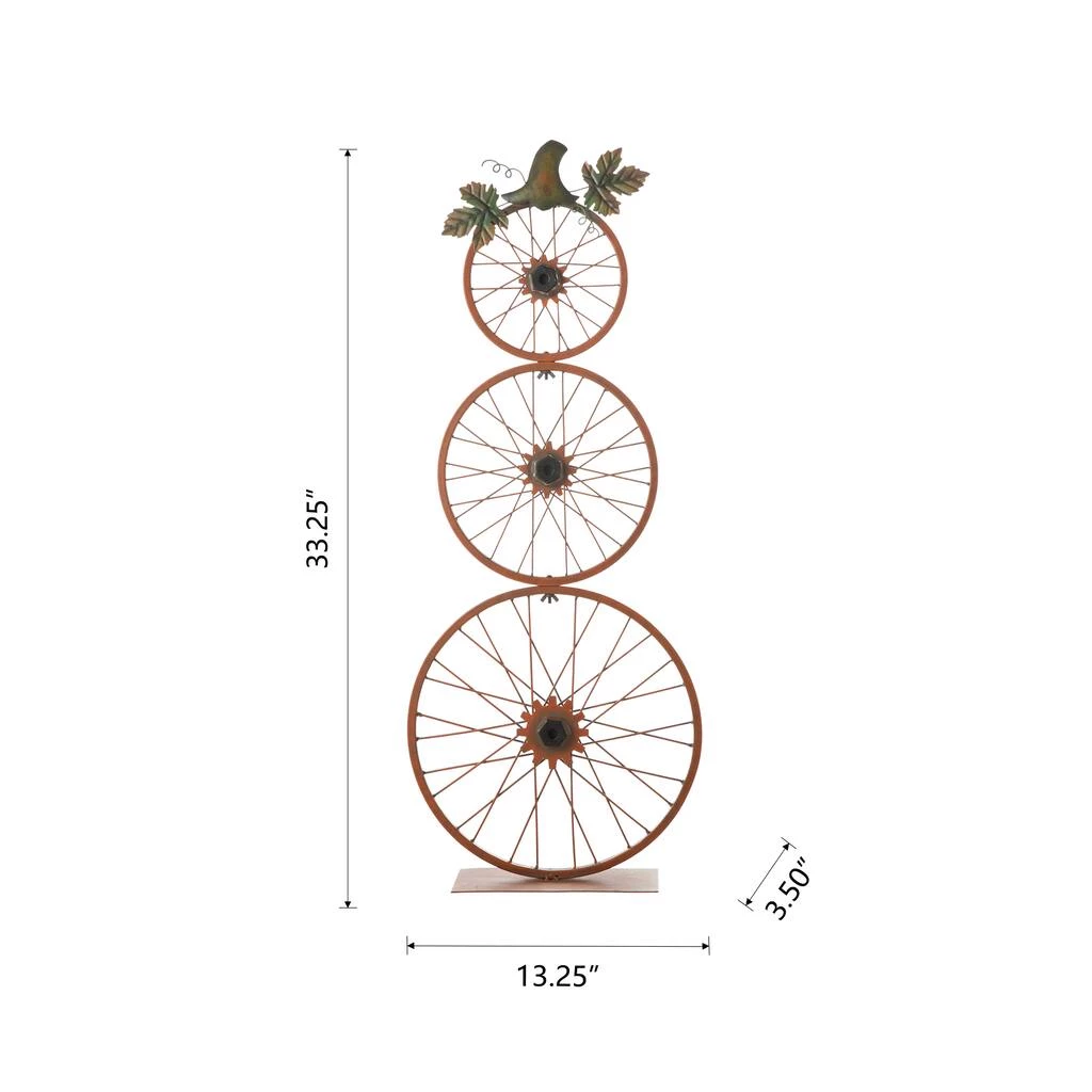 This metal bicycle wheel pumpkin porch sign is stacked vertically, which is made up of three bicycle wheels and metal base. It’s a creative and eye-catching fall decoration for your home. Display this decoration in indoor or outdoor locations.