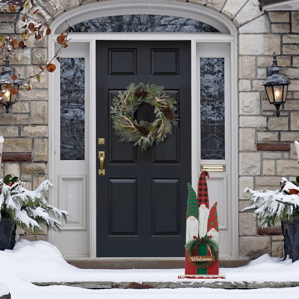 This charming Gnome family porch décor will make a great addition to your holiday theme. It features the word “Welcome” with a rattan wreath in front of baby gnome. This piece can be displayed as one porch decoration or detached into three separate items for multiple decorations. Made of durable wood, the family design gives a festival atmosphere.