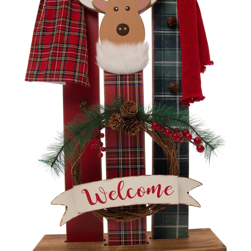 This charming reindeer family porch sign features the word “WELCOME” with a rattan wreath in front of baby reindeer. It’s made of wood, the family design gives a festival atmosphere. This sign makes a unique home dΓ©cor item. You can use it to decorate areas such as your loft, foyer, porch or living area.