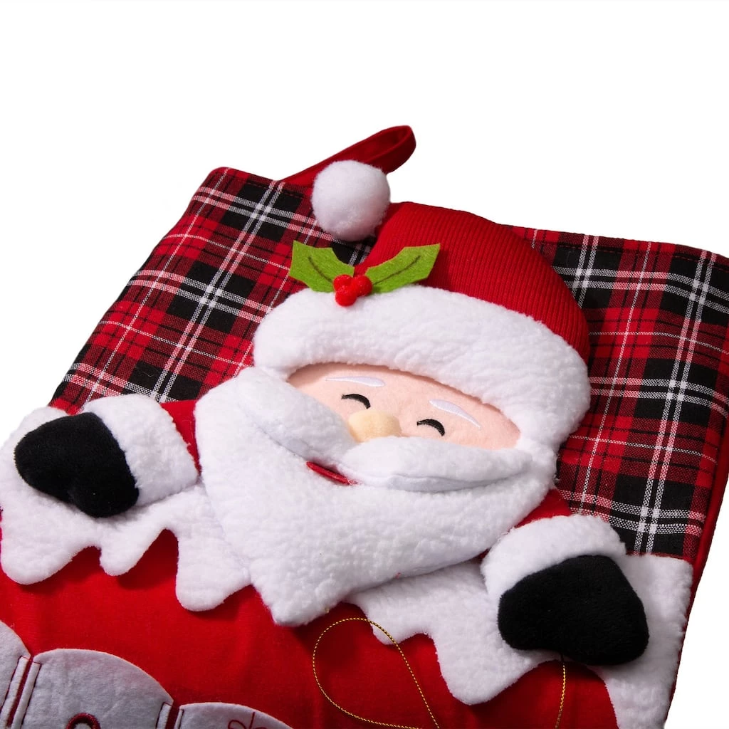 The oversized Christmas stocking crafted with 3D Santa and countdown calendar. Count the days until Santa Claus fills your stocking with this plaid cuff Christmas stocking. A lovely additional to remind you of the big day!
