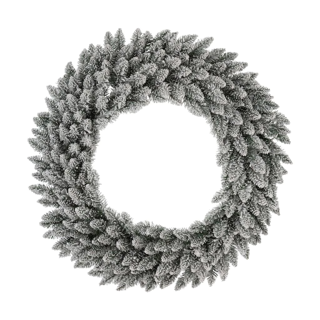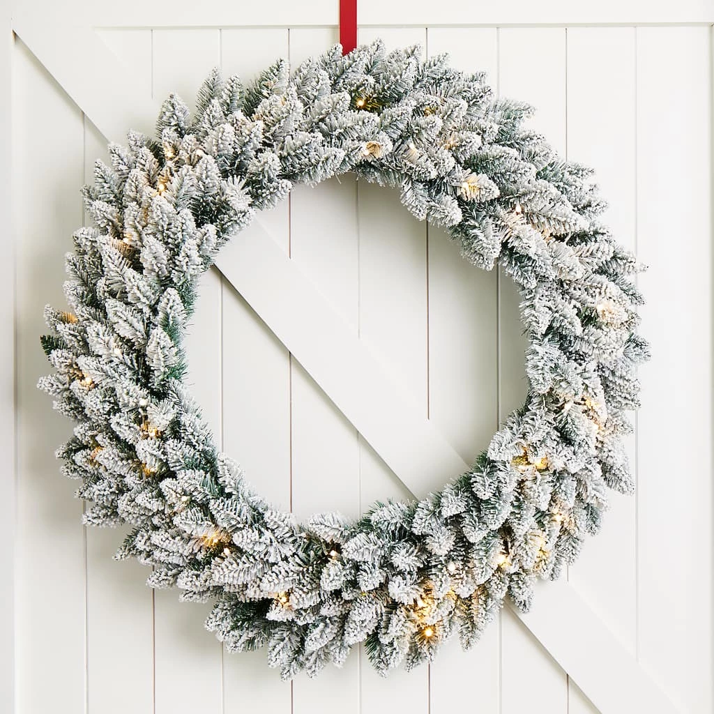 The snow flocked 36″ Christmas Wreath crafted with pine needle tips will add a touch of charming light and cheer to your front door or window during the holiday season.