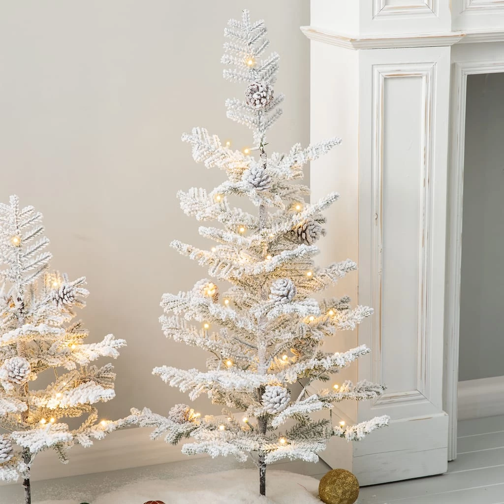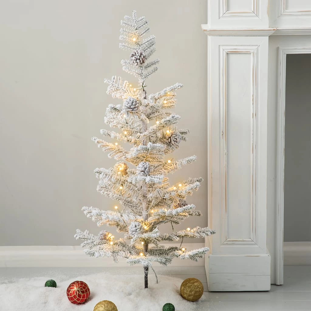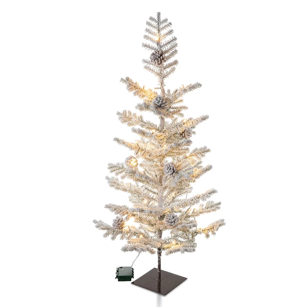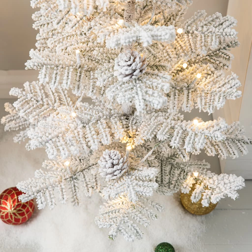 The 3 ft. pre-lit flocked pine artificial Christmas greenery table tree features crafted branch tips to create a warm festival ambiance with pinecone accent to any space and daily dΓ©cor for your house and work space.