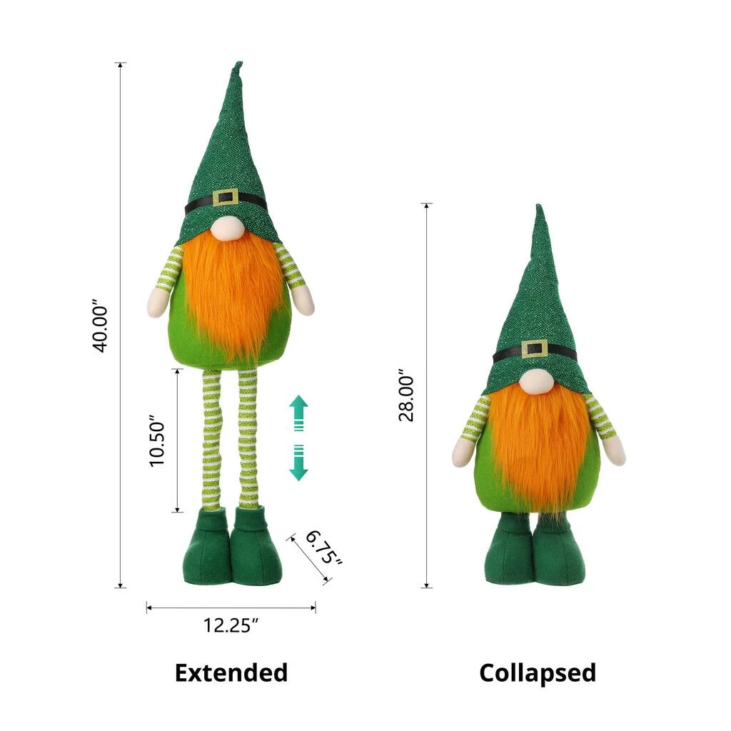 This St. Patrick’s Day gnome is just the thing you need to add a joyful, festive atmosphere to your home. This adorable standing gnome with expanding long legs showcases a cute nose, orange beard, and soft velvet body. It can stand on the table, floor. or any flat surface in your home, bring back childhood memories and added holiday cheer.
