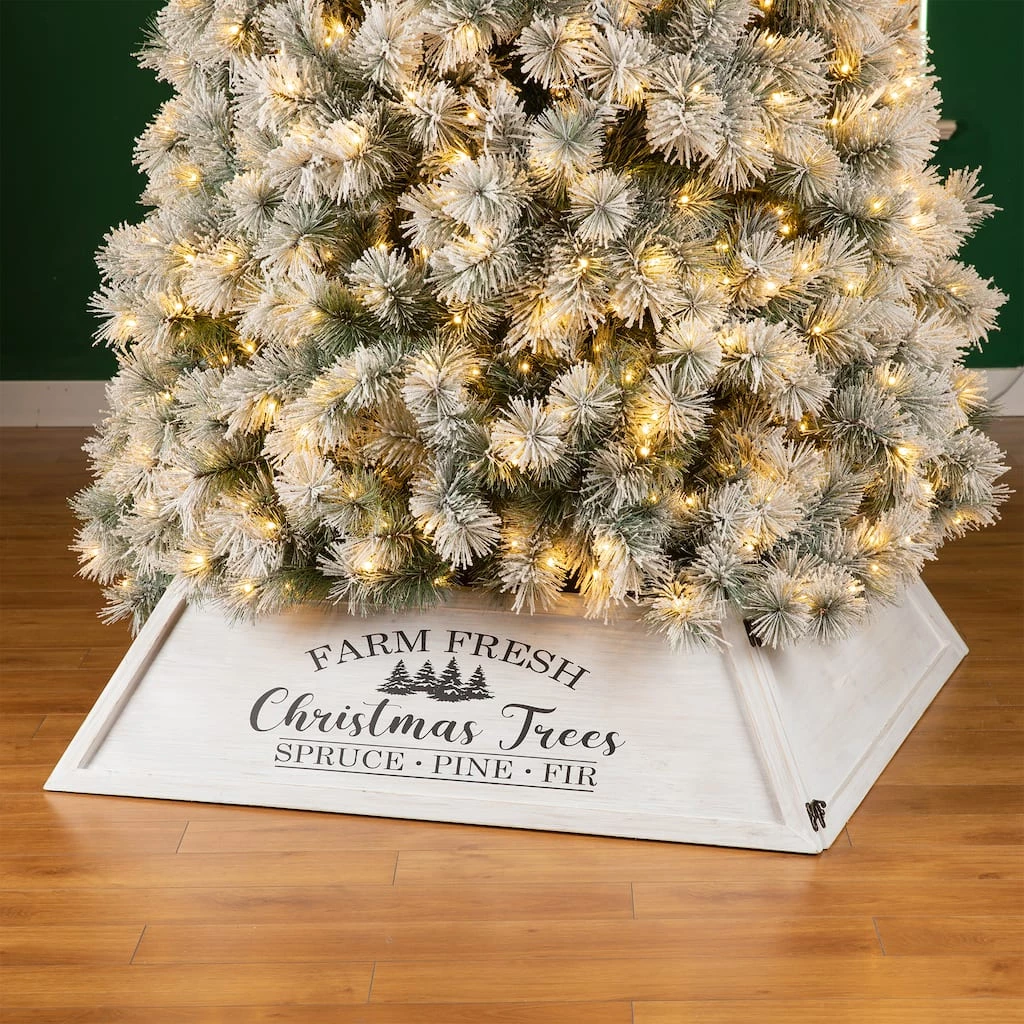 Our handcrafted tree box collars add a rustic, elegant charm to any home or business. The tree boxes not only add beauty and hide the undesirable parts of your tree, but they also prevent kids and pets from getting into the bottom side of your tree. They are made of solid wood. You will simply take the 2 side panels and lock them into the front panel. From there you can then slide your box into place in front of your tree. The trapezoidal design adds your tree with uniqueness.