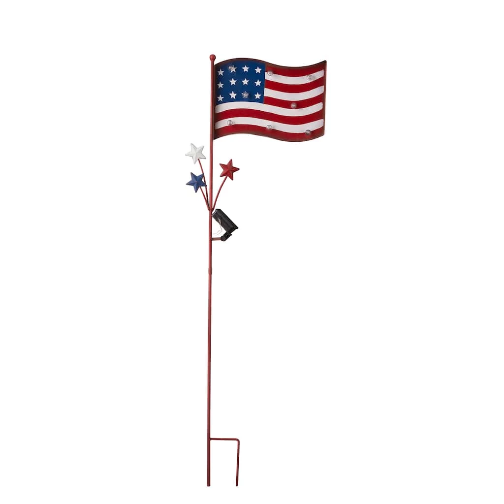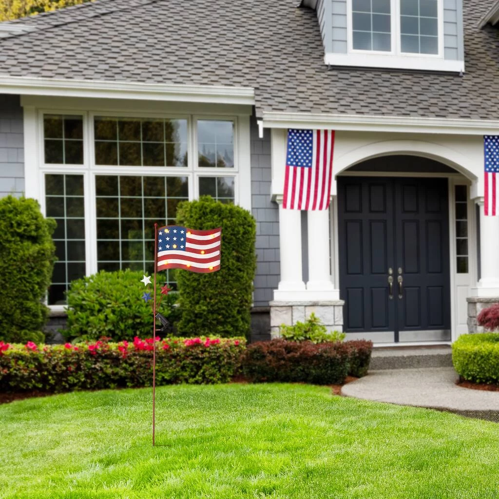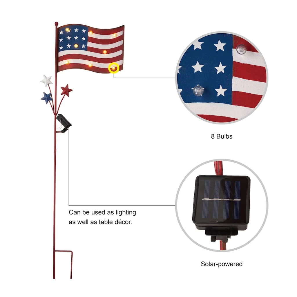 This metal American flag yard stake is solar powered and it has two functions, yard stake or wall decoration. A decorative top is shaped like the American flag which is decorated with 8 bulbs.