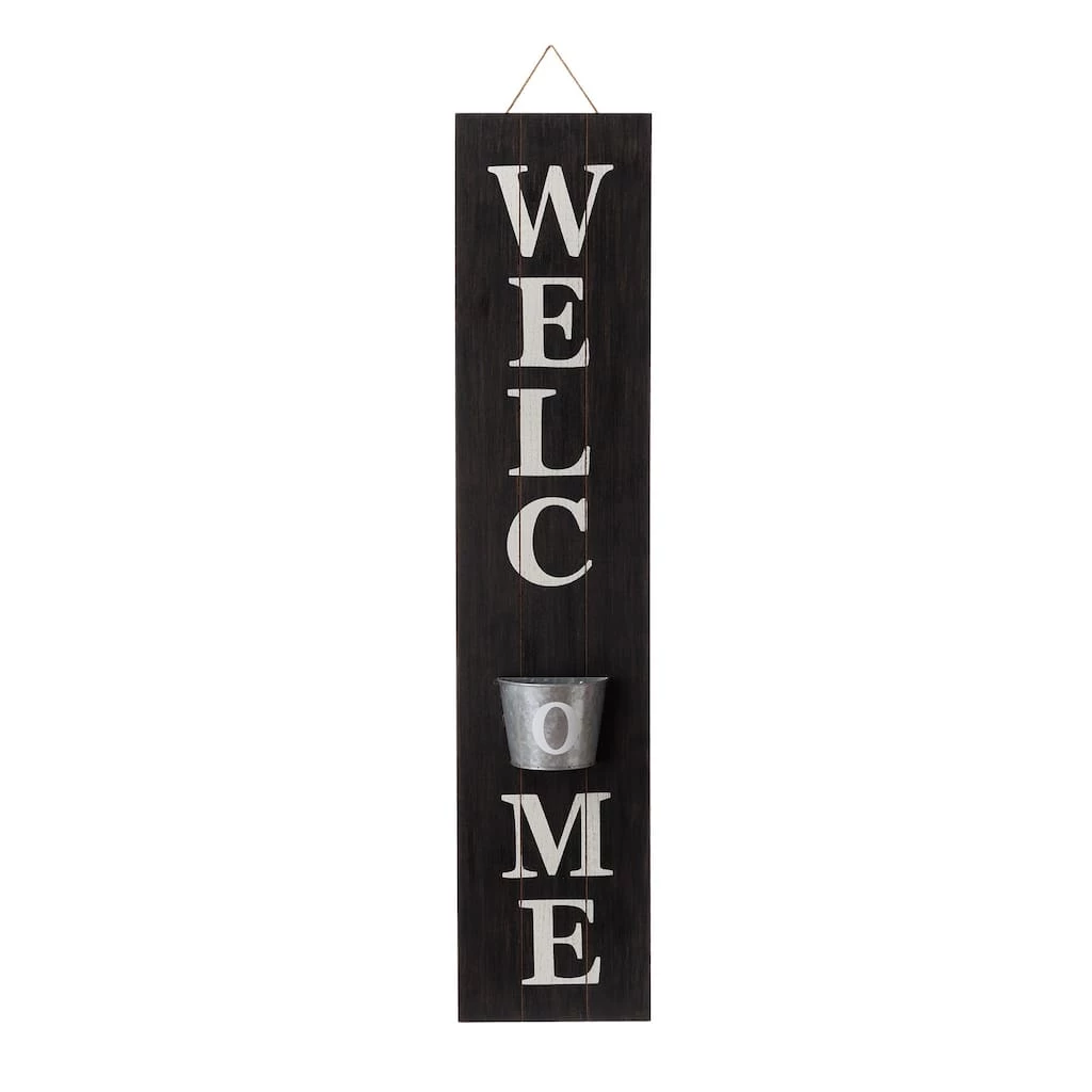 Add some seasonal cheer to your space with this welcoming planter porch sign. This porch sign features “WELCOME” with a small metal planter to hold plant arrangements. Perfect for placement on the front porch, home’s entry, in the garden, on the patio, or any other spot.