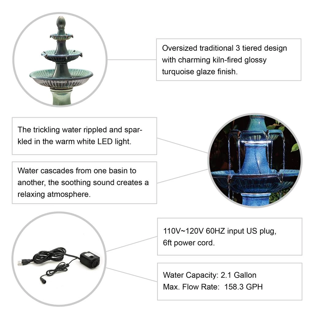 Create a calming oasis and bring an artistic touch to your space with this stylish and classical ceramic fountain. The tired design lets the water come to life that looks vivid and interesting. Water bubbling up, cascading down through one tier and spilling into another, the soothing sound of cascading water helps to create a relaxing and meditative atmosphere. This versatile fountain will be a delightful addition to any of your garden, patio, deck, porch or home space.