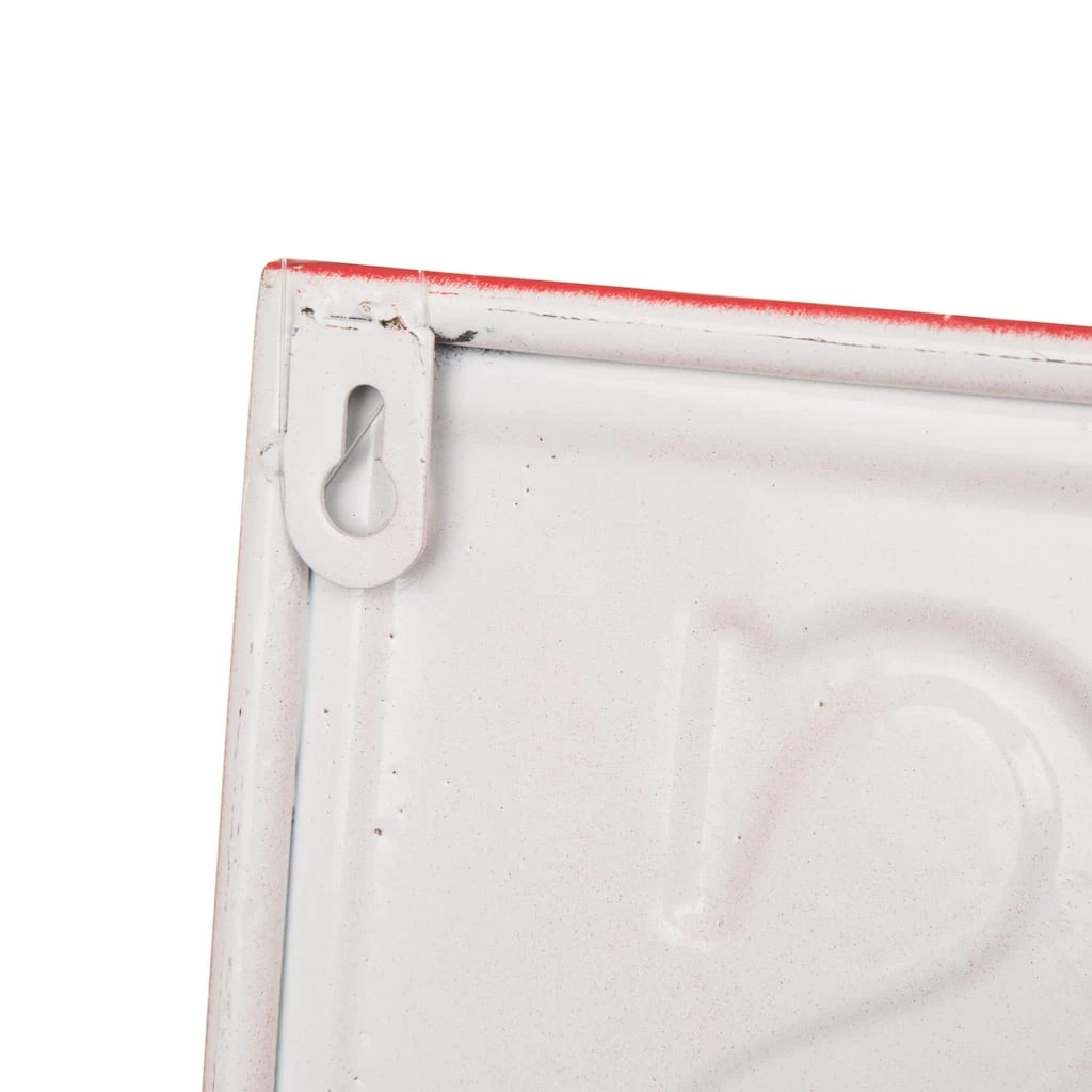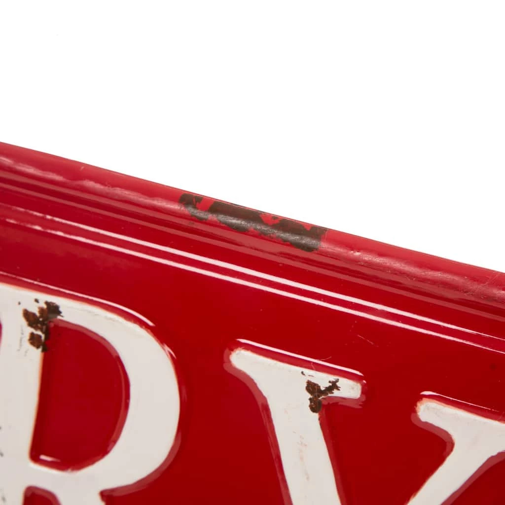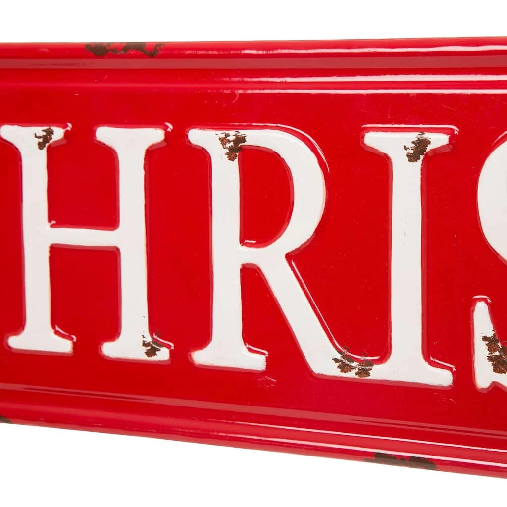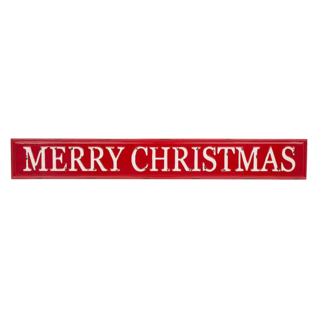 This is a handmade, distressed, Christmas sign that says, “Merry Christmas” in script lettering, painted in red with white lettering.Β