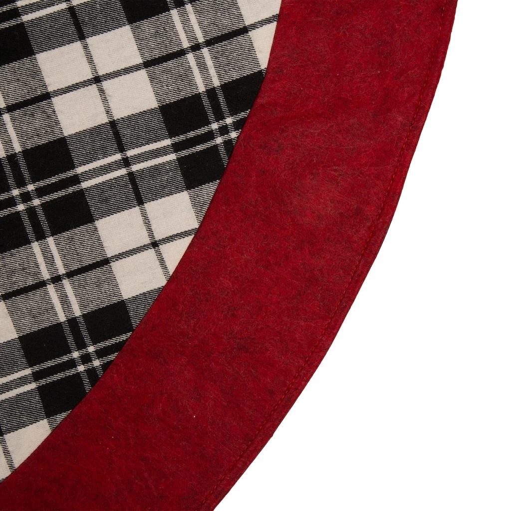 This traditional black, white, and red plaid tree skirt is sure to transform your Christmas tree. It will look great underneath a fully decorated flocked pine.