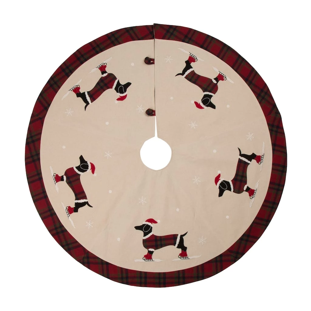 This tree skirt features a lovely Christmas Dachshund design and is sure to enhance your Christmas tree. Pair it with a beautiful flocked pine tree for the perfect look.
