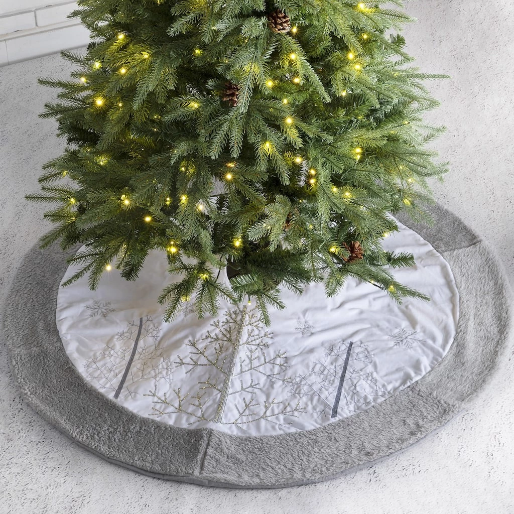 Treat your tree right with the final touch in a soft faux fur tree skirt. Adds the perfect layer for piling the presents on and protect floors. The crisp white faux fur creates the look of freshly fallen snow to give a lovely festive style. Warm fuzzy velvet provides an eye-catching base for the applique and embroidered designs.