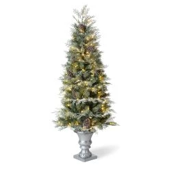 This 5 ft. mixed tips pine entrance potted tree with decorative urn base is a welcoming addition to a doorway, deck, porch or patio. It features snow sprinkled branches and is trimmed with rustic pinecones. This tree is pre-lit with 180 warm white lights that remain lit even if a bulb burns out. Display this attractive greenery in any indoor or covered outdoor location.
