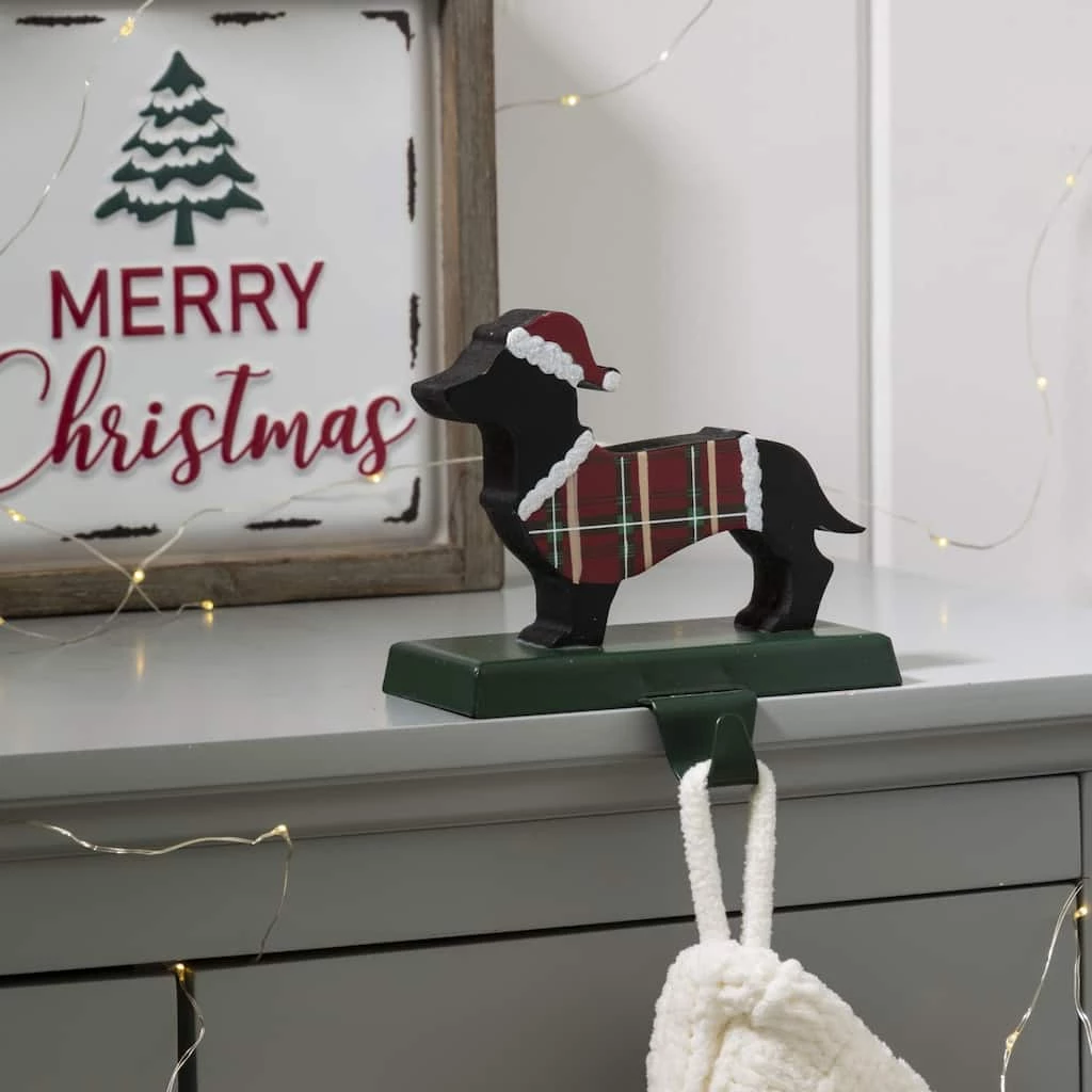 This cute stocking holder is a standing Dachshund in a plaid clothes and a red Santa hat. It will be sure to add the perfect finishing touch to your mantel display!