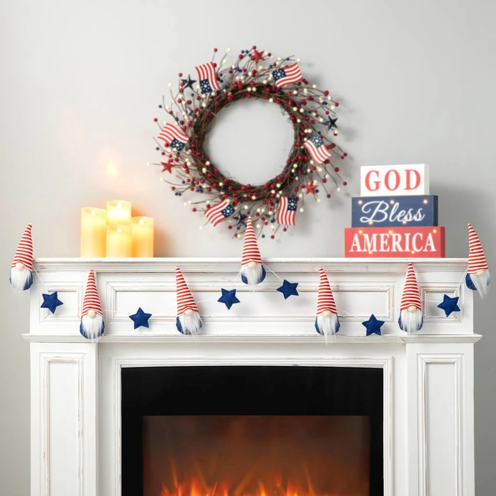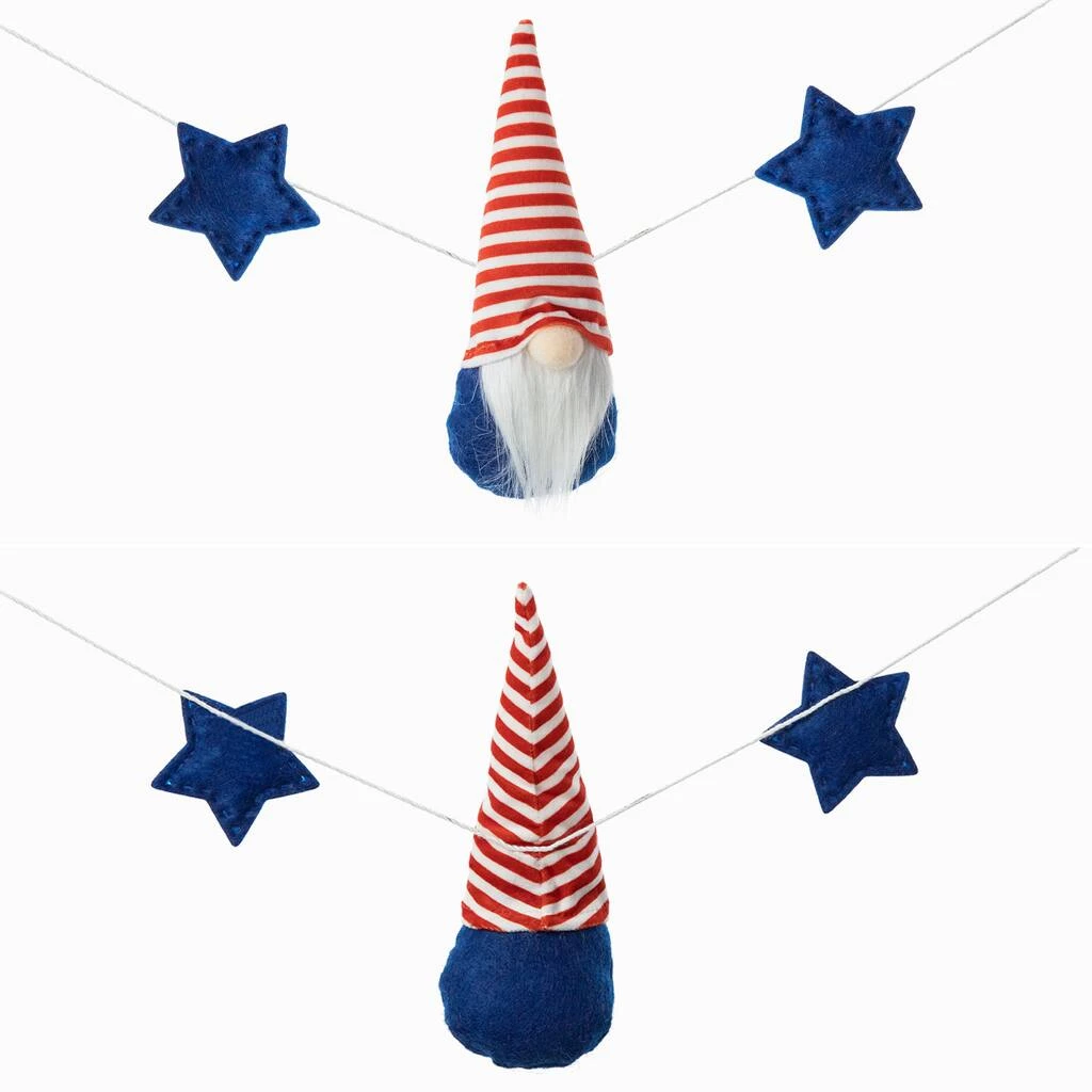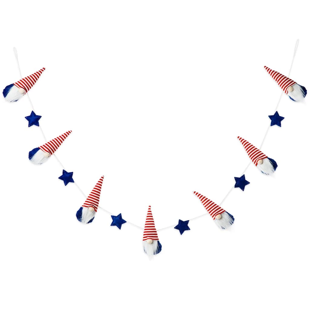 This cute patriotic gnomes garland is the perfect addition to your holiday house collection. They feature red and white hats, soft blue bodies and faux fur beards.