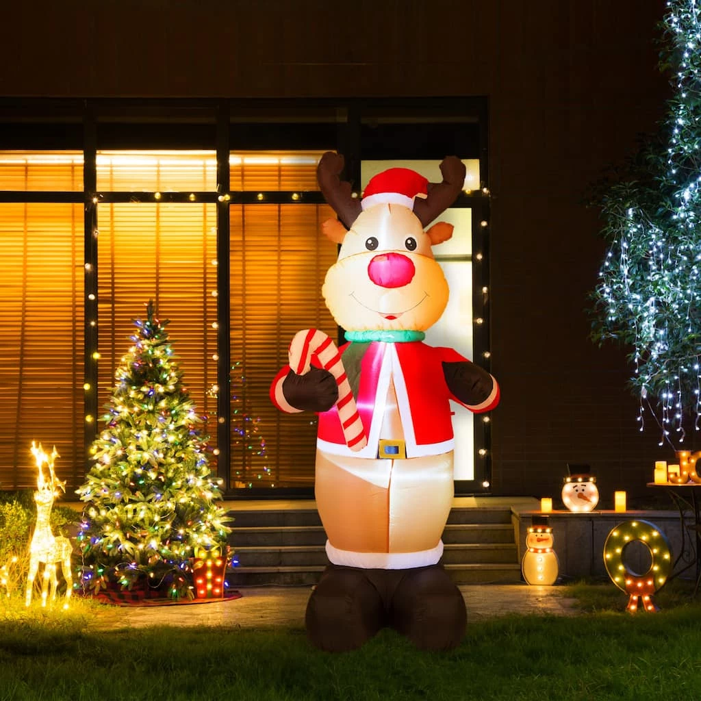 Delight guests and neighbors with an adorable inflatable reindeer decked out for the season in a Santa hat and green scarf! Display this whimsical holiday decoration as a standalone or combine it with other characters to create a custom scene.
