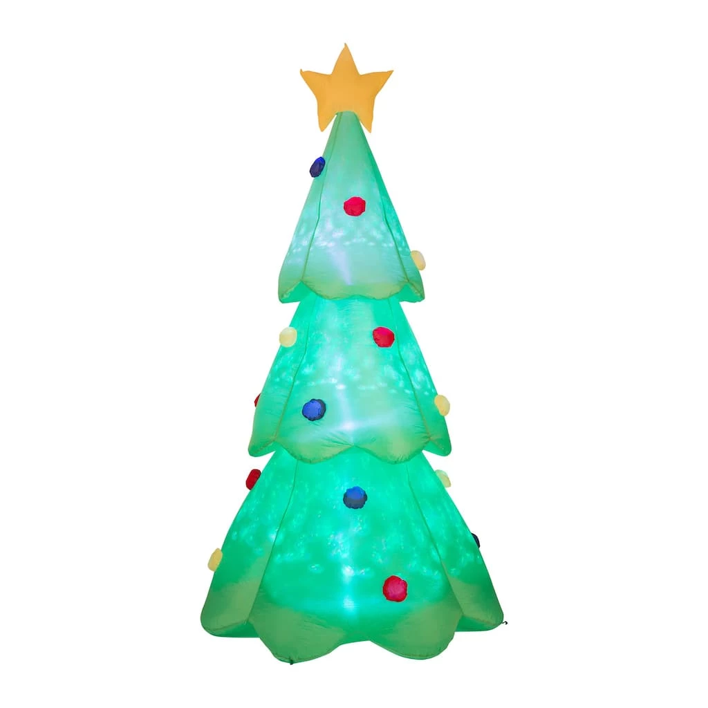 Deck the yard with this show stopping Inflatable Christmas tree featuring shiny metallic ornaments! Accented with a gold star, our inflatable tree makes a striking addition to your outdoor Christmas decorations. Setup is super simple. Just plug it in, stake it down and watch the magic unfold.