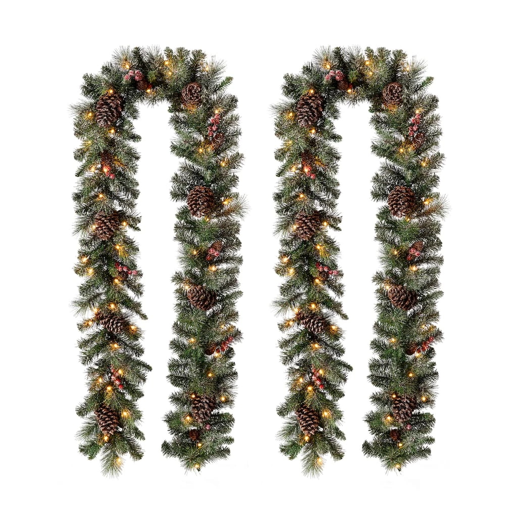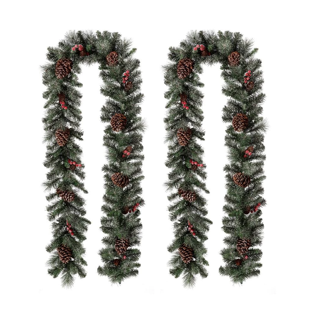 This set of garland provides ample length to easily adorn doors, mantles or banisters, making this versatile decoration ideal for any situation. Each of the 180 tips is modeled to a pine tree while the frosted design creates a winter wonderland around your home. Several large pinecones and berry decorations among the needles add an extra holiday touch to this garland, creating the perfect holiday touch for your home.