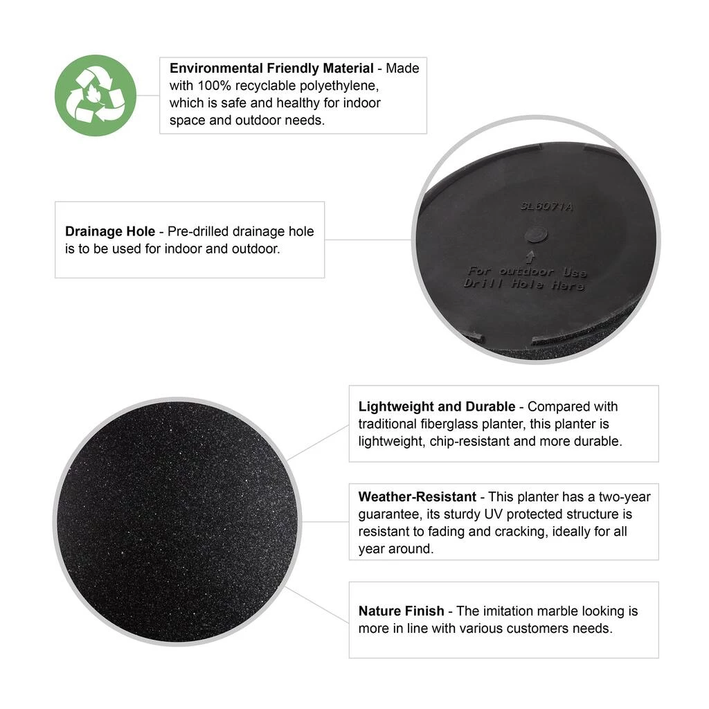 Plant and display your favorite greenery with our oversized pot planter. Made from recyclable polyethylene, which is safe and healthy for indoor space and outdoor needs, the imitation marble is more in line with various customers needs. Compared with traditional fiberglass planter, this planter is lightweight, chip-resistant and more durable. It has a two-year guarantee, its sturdy UV protected structure is resistant to fading and cracking, ideally for all year round.