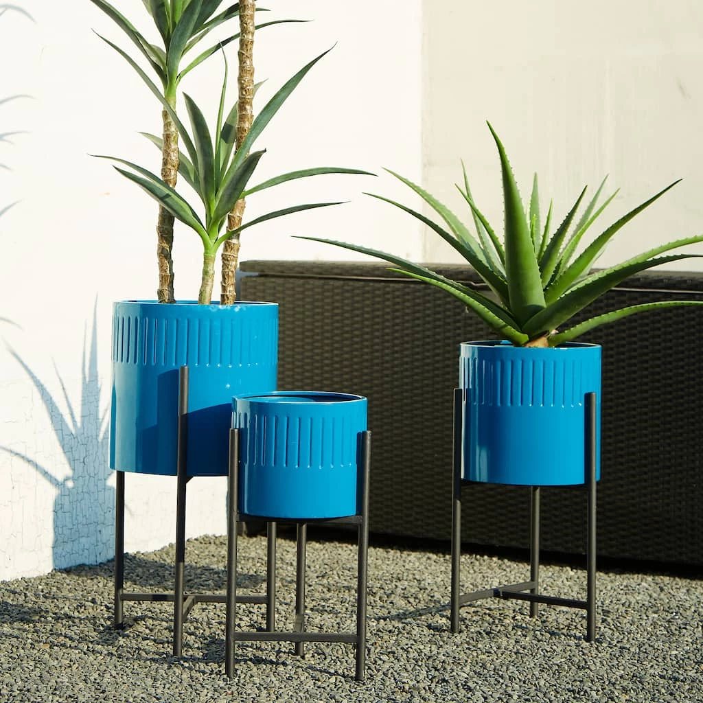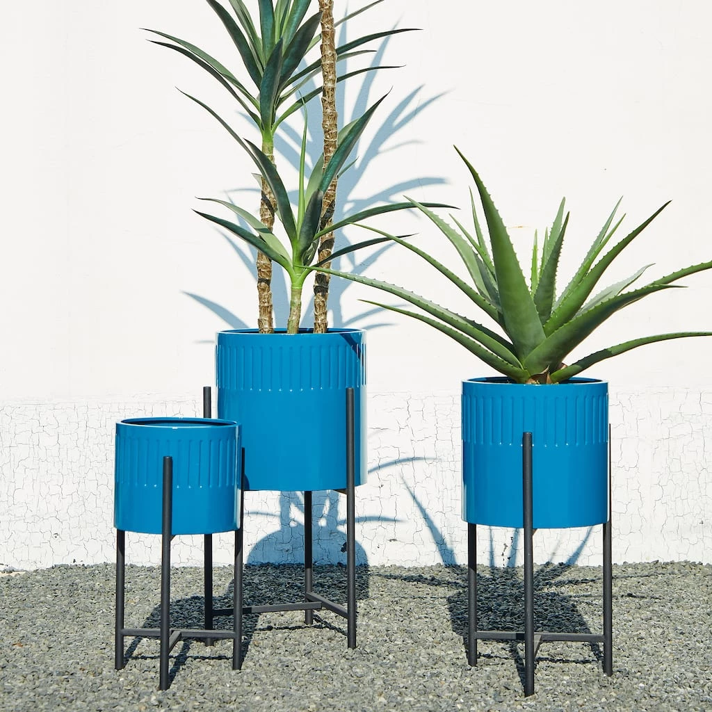 This simple and modern blue design plant stand set can easily adapt to any of your dΓ©cor styles. It fits into corners to brighten up dark spaces, or on a front porch to welcome visitors. The set of three different sizes creates a more interesting balance for your space and makes planting less conventional.Β