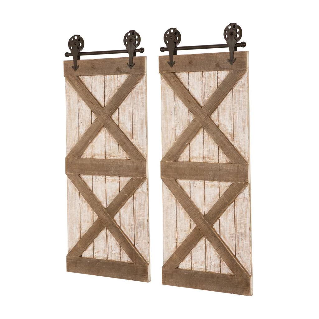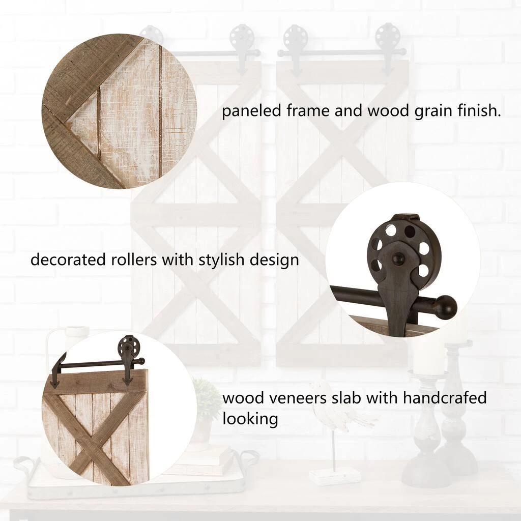 This barn door décor combines the beauty of wood with quality craftsmanship that is both visually captivating and reliable. The barn doors create a focal point and add charm to any home. They’re a perfect choice for tight spaces, especially where a swinging door may be difficult or awkward, because they conveniently slide open along an upper track. These doors are perfect for a study, dining room area, or an elegant transition between spaces. These barn doors enhance and unify your space with light and beauty.