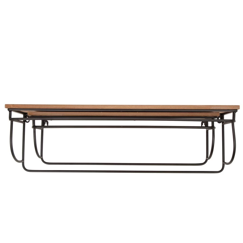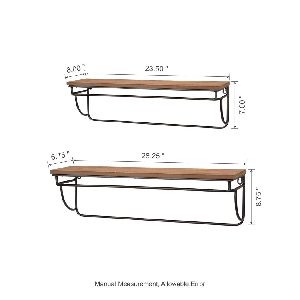 Display and store small decorative items or miniature plants on this set of two wall-mounted floating shelves. Put them in your room or hang in your kitchen for extra storage for cups or spices, or simply to dress up any wall space. These modern farmhouse floating shelves are made of natural finished Firwood MDF and matte black metal. With optimum design and color, they can suit any style of home or office, from modern bohemian to industrial minimalism. The thick metal mounting brackets ensure the shelves are stable and weight-bearing, and the keyhole on the back is easy to install.