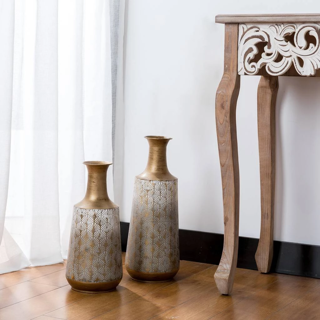 This set of stunningly-shaped vases has a unique design – a gold fan-shaped leaf pattern against a gorgeous white finish! These two vases can be beautifully displayed on their own or filled with artificial flowers. They’re an eye-catching and amazing accent piece for your bedroom, living room, kitchen, bathroom, entryway, or any other indoor space.