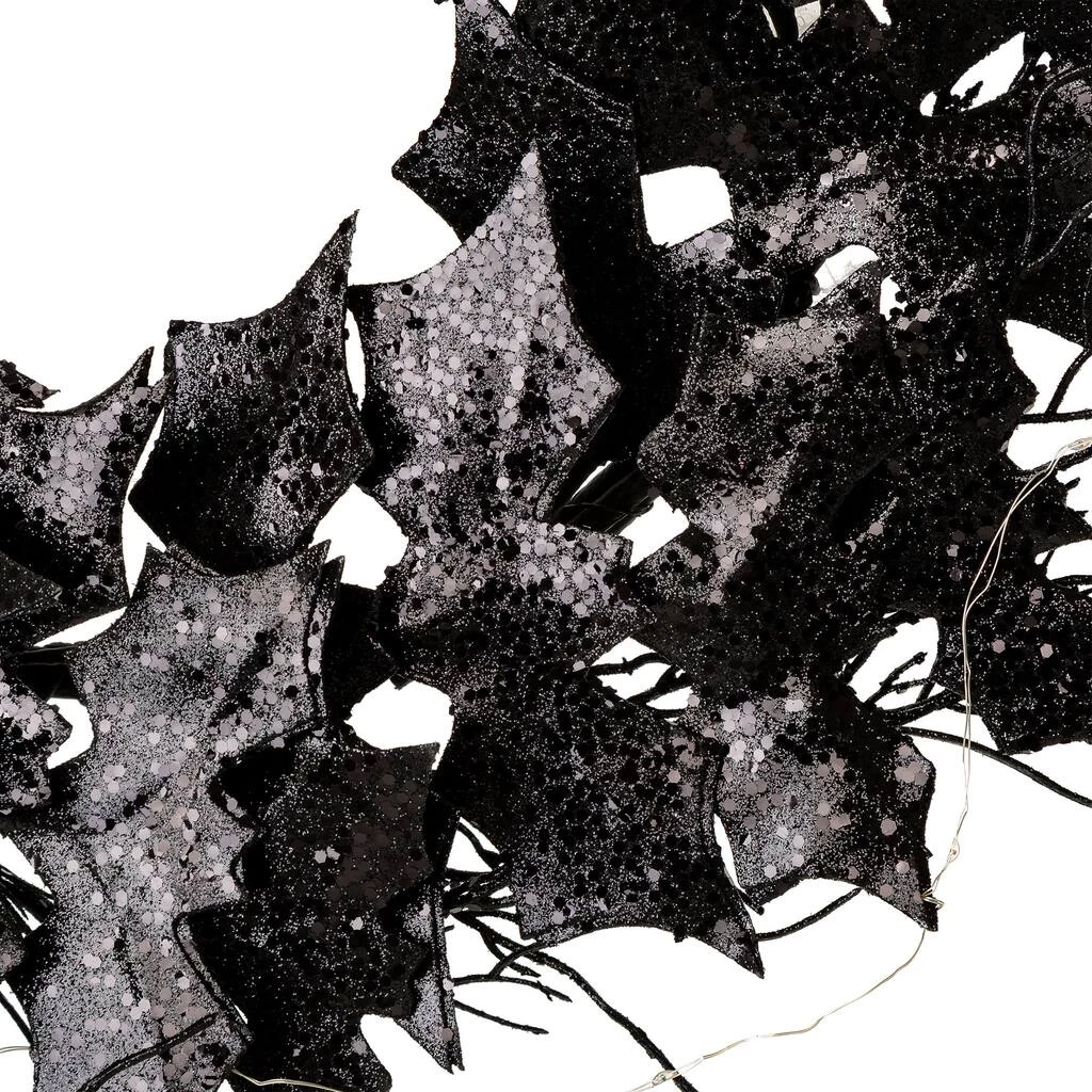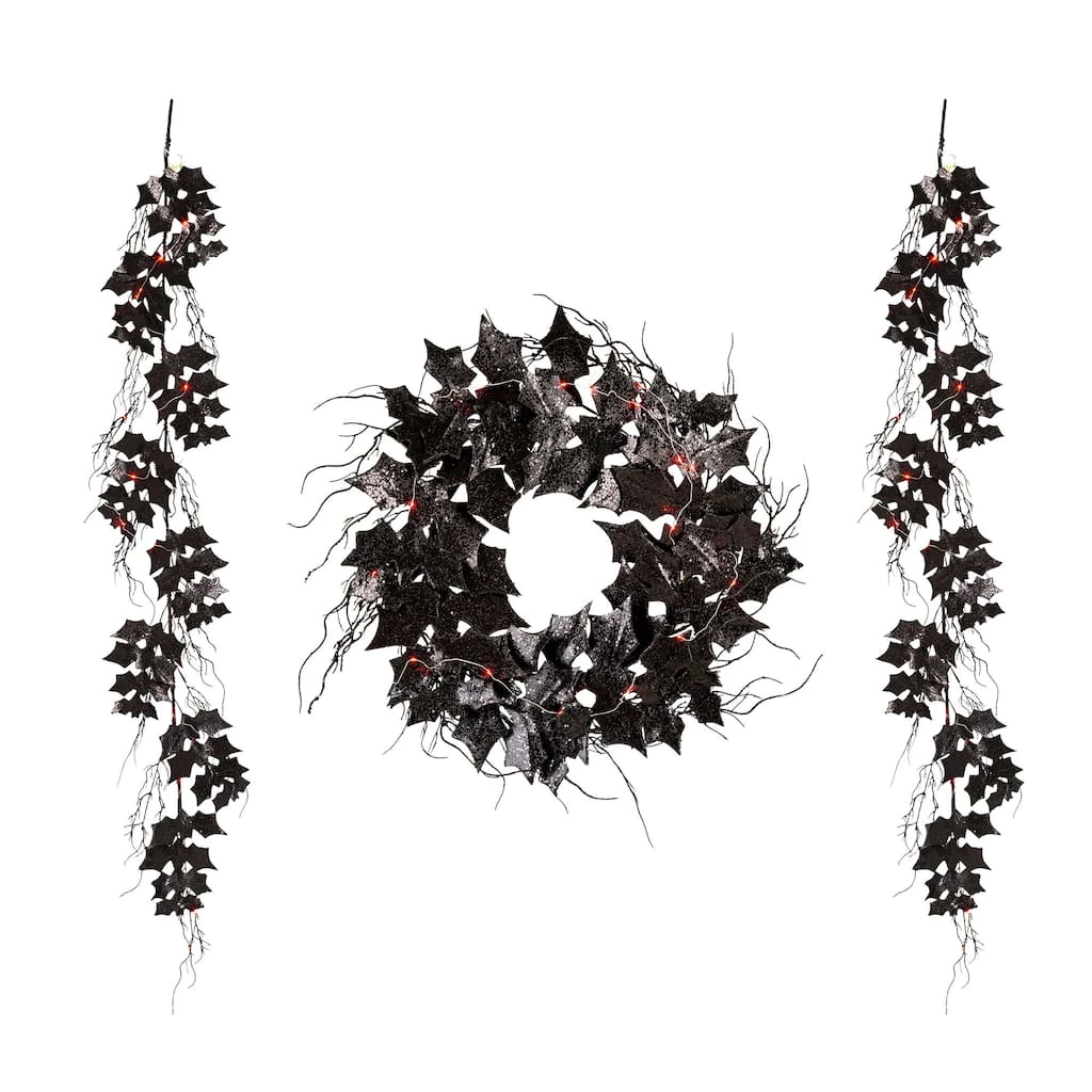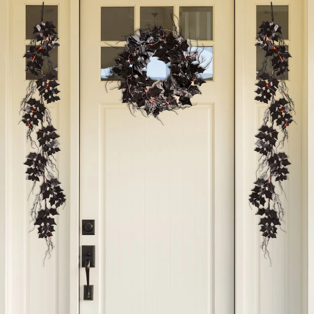 Add a fun Halloween wreath or garland to your door or home. Creepy bats are set in a swirling pattern on a wire frame wreath or garland. This decoration works well on your front door or mantel. The beautiful Halloween wreath or garland is set on a natural twig base and can be easily stored.