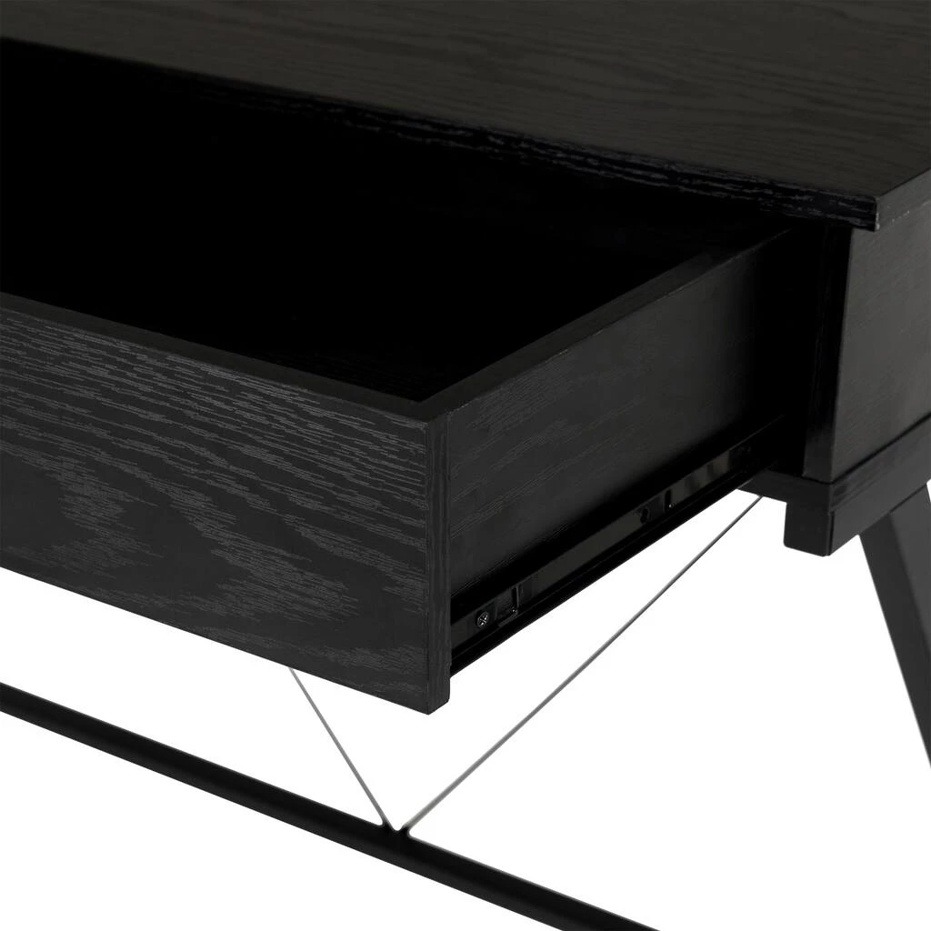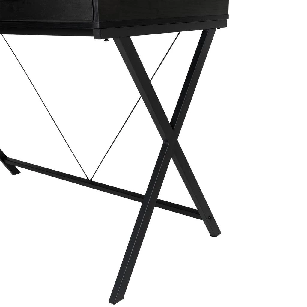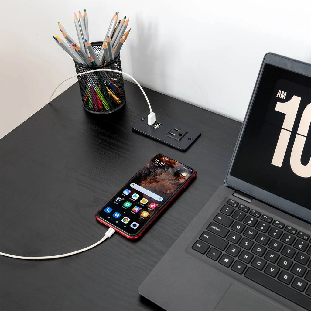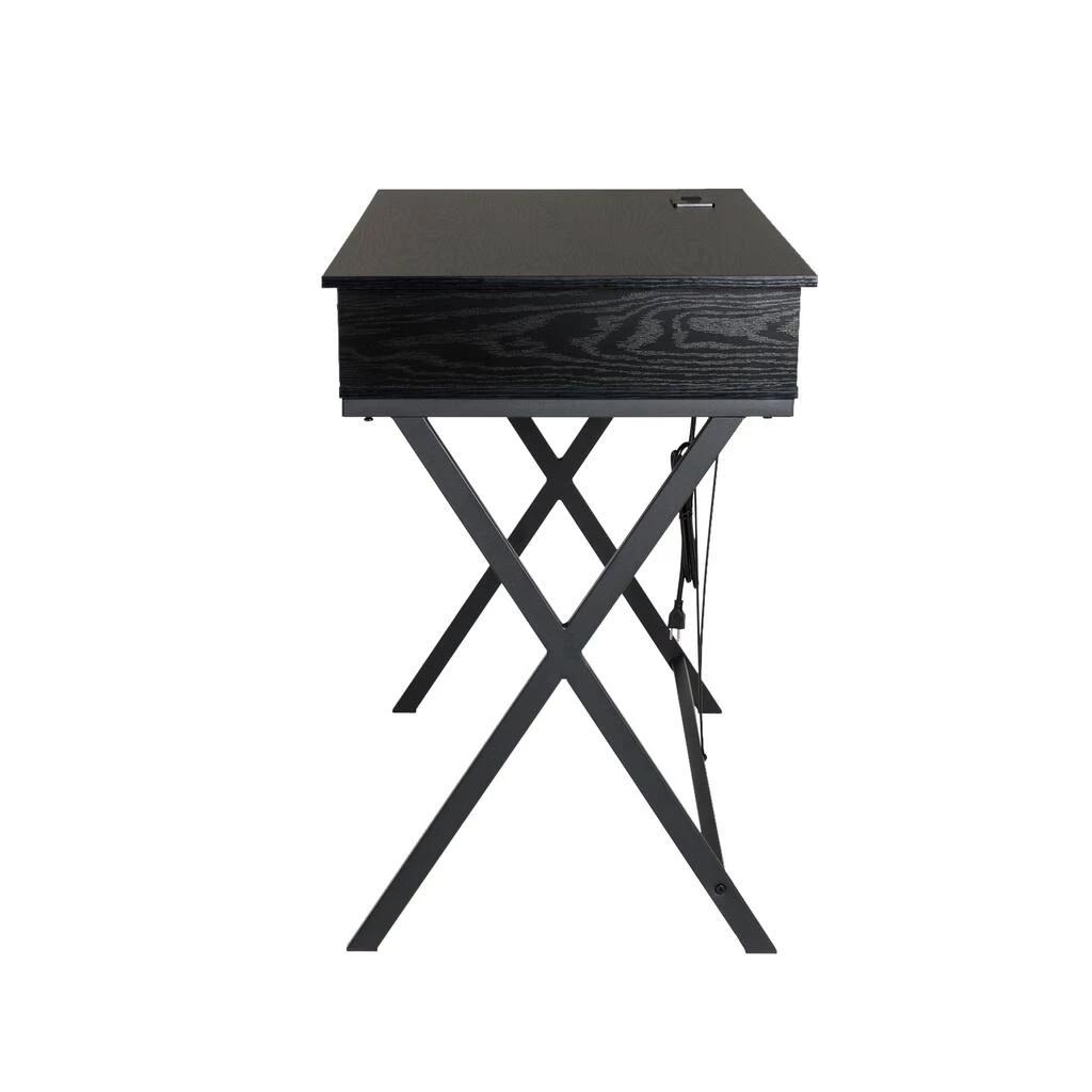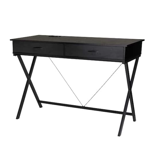 Anchor your home office or study space in modern industry style! This two-drawer writing desk is a must-have piece. Crafted from manufactured wood with melamine finish, which features the textured appearance and natural wood grain surface, it strikes a clean-lined rectangular silhouette on an X-frame metal base and adds a V-shaped bracket for enhanced stability. For additional storage, it comes with two storage drawers for all your essential needs such as books, magazines, stationery, or even snacks, which can make your desktop clean and neat. In addition, two fast-charging USB ports and one outlet bring the most convenience to your devices for daily work activities.